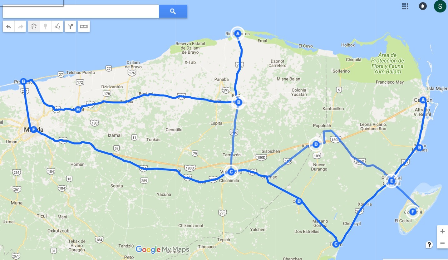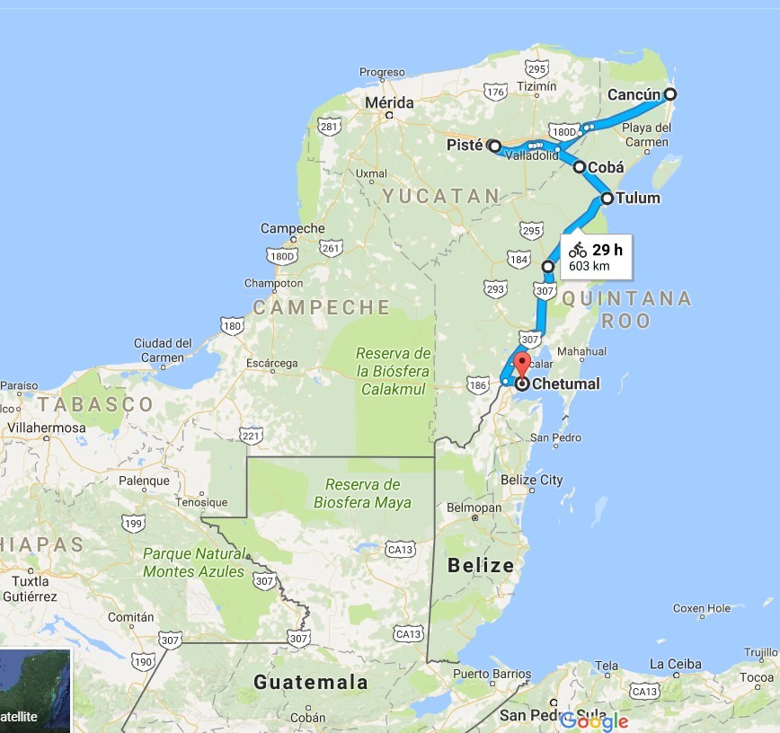 It looks kind of a short fat blue line, but as you can see on the map it's actually 600 km each way. There is also a minimum 90 km stretch in there that is straight through a jungle/scrub desert with almost no services (Tulum to Felipe Carrillo Puerto - not visible on this map)