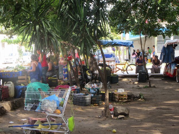 Unlike Puerto Morelos, the major parts of Playa del Carmen are all on the east side of the highway. But it is still possible to spot the parts. Right at the highway begins the town where the long term residents are. This features the standard crumbly but charming Mexican hodgepodge of buildings and activities. One that we liked was a little market that had two small fruit vendors. In fact one lady had strawberries only. We bought a pint or so, for 20 pesos. Interestingly, she asked us the same price as we had seen locals giving her. Unfortunately these were "Mexican" type strawberries (duh!), the ones we usually avoid back home, at least whenever our lovely local variety is available. Mexican strawberries uniquely have no flavor.