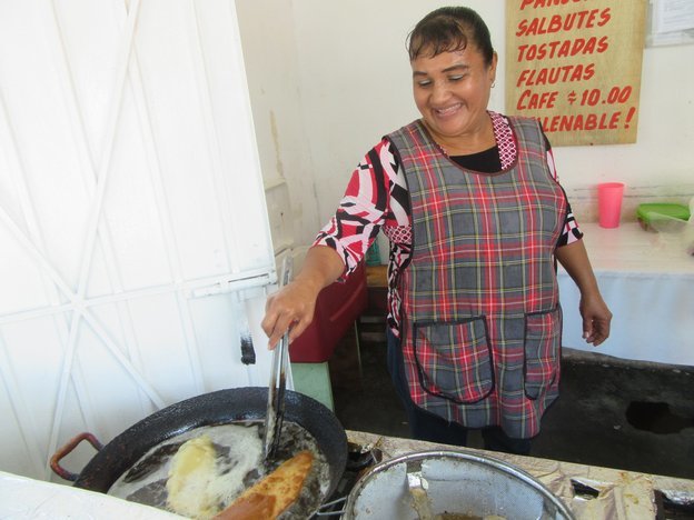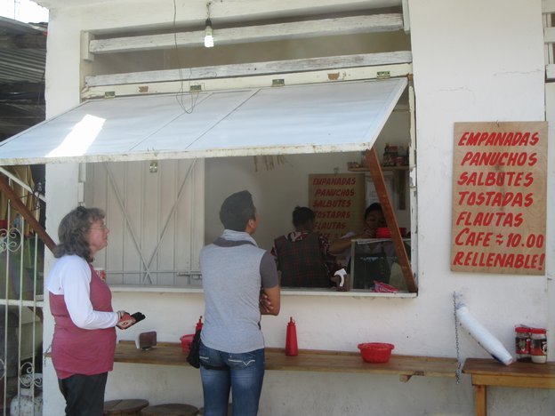 Our next stop, still just inside Playa, in the "real" not tourist city, was a stand selling filled, deep fried specialties. Technically the sign offered empanadas, panuchos, salbutes, tostadas, and flautas. And empanadas, for example, should be capable of having at least a choice of chicken or beef filling. So we enthusiastically told the lady our choices. But it became clear that like with Henry Ford's automobiles, you could have anything so long as it was a black Model T. We got cheese empanadas. And - they were great!