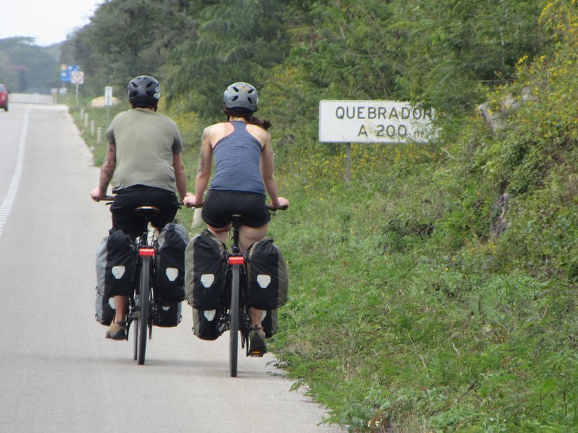 Ingeborg and Jelle stayed behind, as they were working on the purchase of a mask. But since they too were going to Chichen Itza, we knew they would pass us soon. So they did, and I was amazed at how quickly they went on fully loaded bikes. We hope to see them again, either at the ruins, or in Belgium!