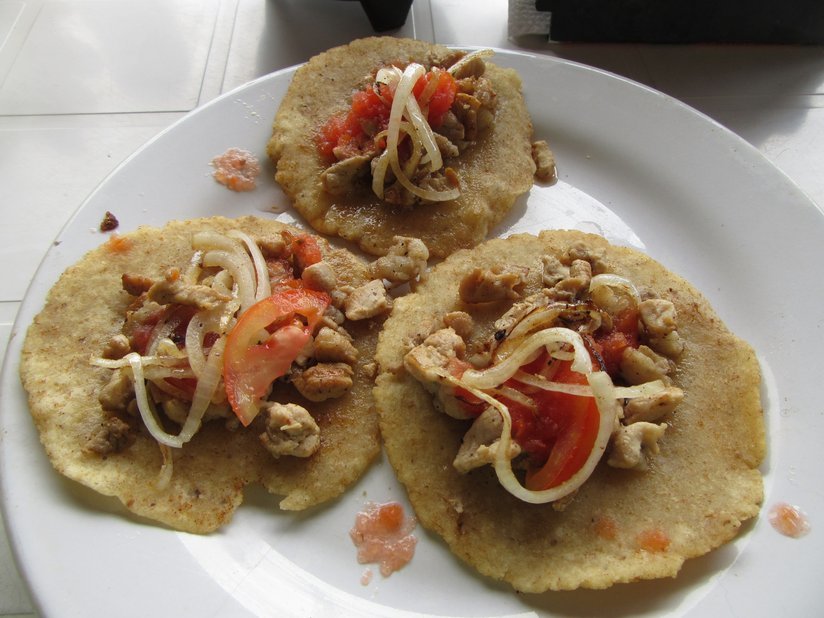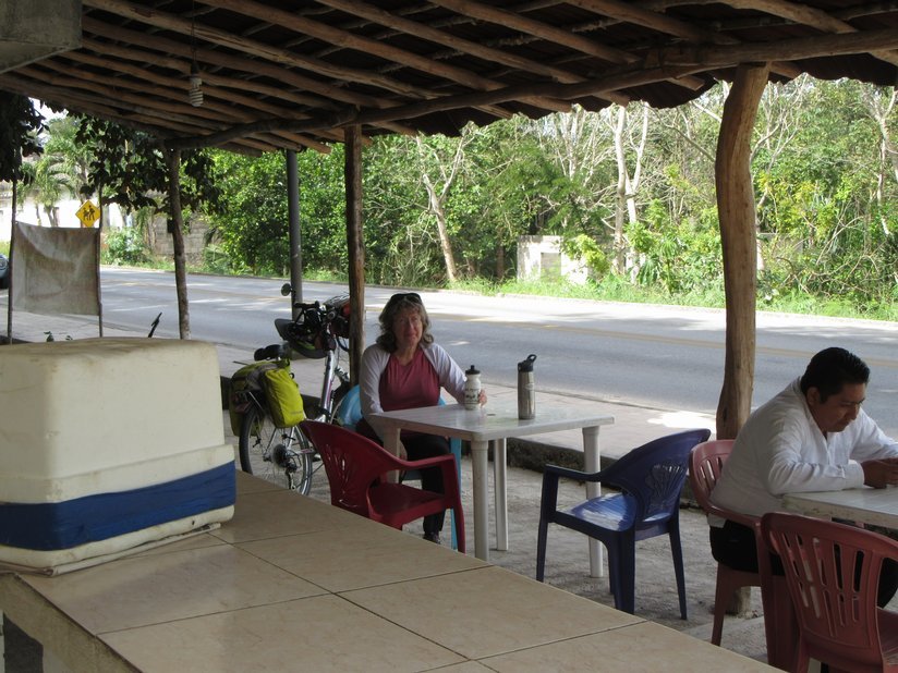 Our OXXO breakfast was by now not providing much power, though we had also scored a "pan dulce" from a vendor on a bike cart. So in the teeny town of Xcalacoop we stopped at a little stand called Mr Tacos. Whether tacos were indeed available I'm not sure, and two other customers had tortas. But we went for salbutes - bits of chicken, onion, and tomato on a tortilla like base. These were 8 pesos each. Dodie got two, I got three!