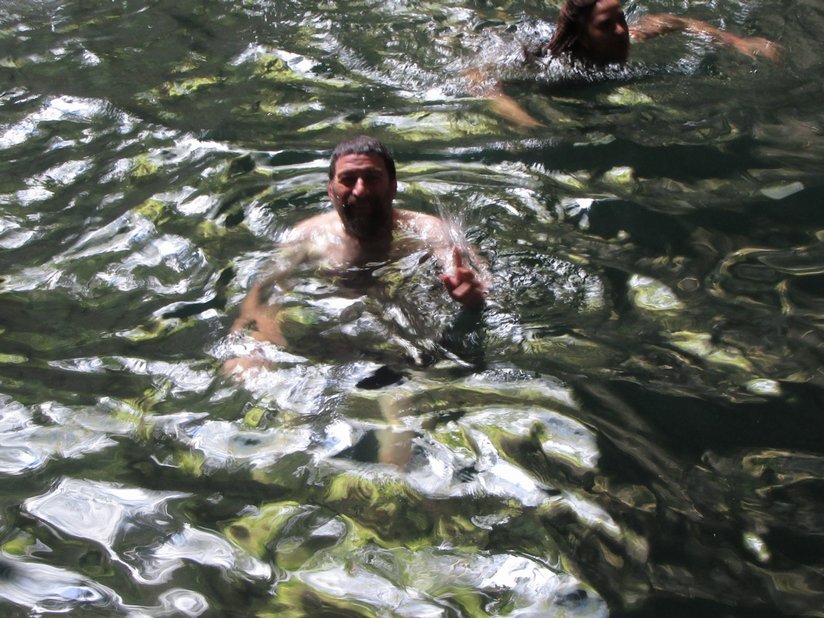 Dodie did not end up going in. She was quite reasonably scared off by the compulsory cold shower up at the top, which is followed by a cold descent to water level. And once you would jump in, the only escape is by a fairly slippery ladder. Better to stay ashore and take pictures - that is what most of the 5 deep tourists were doing.