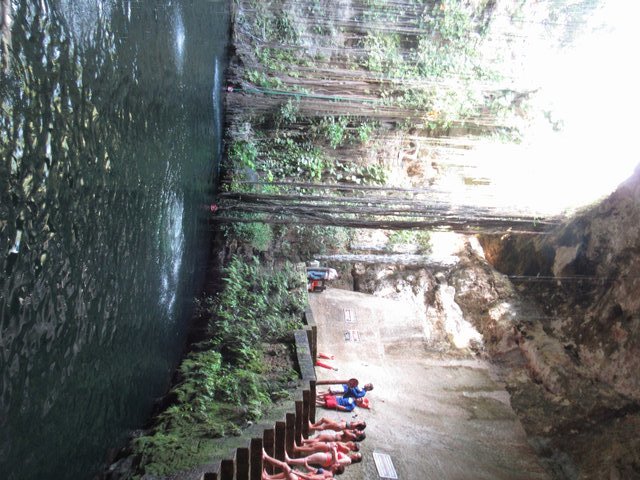 The cenote is not only beautiful, but rather amazing. You have to descend very far into the hole and then the water is 150 feet deep. You have to either be good at treading water or rent a life jacket, because there is no shore - only a deep deep hole.