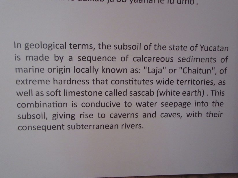 We next came to a famous cave complex, Balankanche. We went on in but were disappointed to learn that access was by guided tour only, and the minimum party was 6. We waited a while for someone else to come, but only scored one other couple. We did see a good summary explanation about all the cenotes and caves of Yucatan: