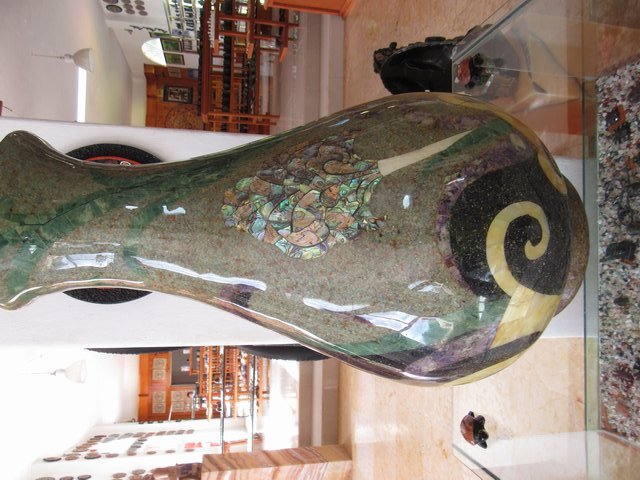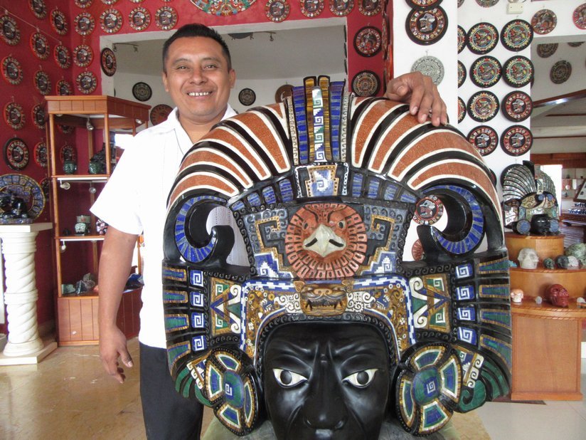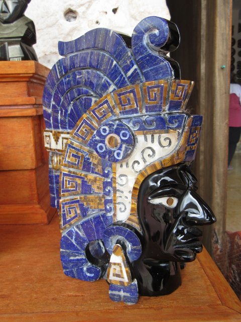 The minerals used are drawn from across Mexico, Central and South America and include jade, turquoise, serpentine, obsidian, amber, lapis lazuli, and silver. The quality of the work is super, unbelievable really. The bigger pieces sell for 5000 US dollars or more, but seem a bargain for the materials and labour involved. Our host was Mayan, of course, and had an excellent knowledge of the culture from which the carvings are drawn, plus the materials.