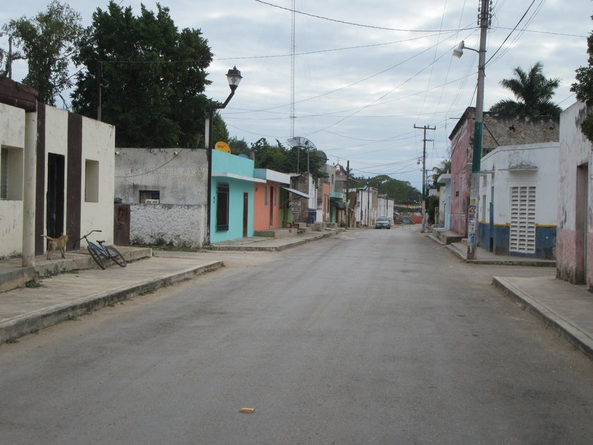 When we got to Dzitas, we took a brief spin through town, mainly because we had seen a cluster of people and wondered what they were up to. In fact it was a communal work bee in which they were mixing up cookie dough, shaping the cookies, and sending them off in a transport bike to be baked. The cookies were made from ground corn, sugar, cinnamon, and butter. They were being being prepared, the people said, for a fiesta of Santa Elena. A man ran into the back and brought out several warm ones for us to try. They were really good, and actually gave us a welcome boost as we cycled on.