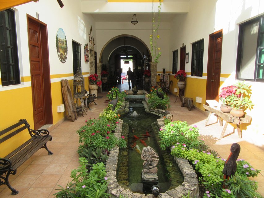 We took a walk around the two town squares in front of our hotel. There is market activity all around, like in the building shown below. We found the post office, which we have been searching for to buy stamps for postcards. Amazingly they claimed to have no stamps - not until Wednesday! Dodie determined that sending our postcards will cost 45 pesos, and she managed to make a deal with the man. She gave him the 45 pesos and in a handshake deal he promised to affix the stamps and send the cards -Wednesday!
