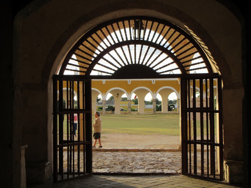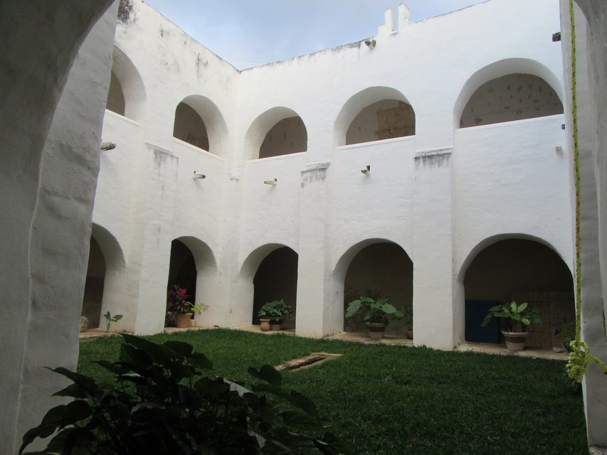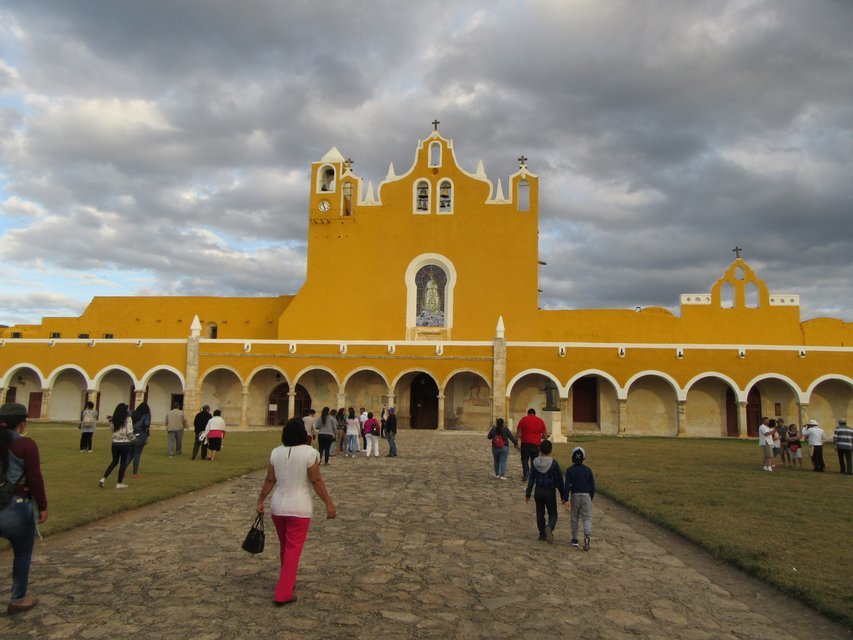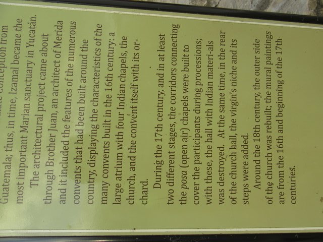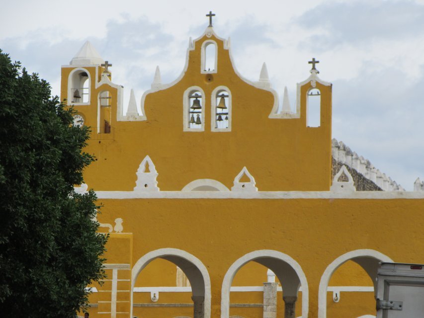 It was a bit of a slog for us, but fortunately the day was somewhat overcast and not too hot. So around 2 p.m. we rolled into Izamal. The town's decor is very unique, and it kind of hits you suddenly. The city is very unique, containing four Mayan pyramids right in the town. One is the largest in bulk ever discovered, with a base of a city block in size. The City in fact is known as a place of three cultures. There is the Maya, and then there is the dominating Convent of San Antonio de Padua, which occupies another city block and fronts on the main square. Finally there is a general Spanish influence, somehow embodied in the fact that every single building is the same shade of yellow.