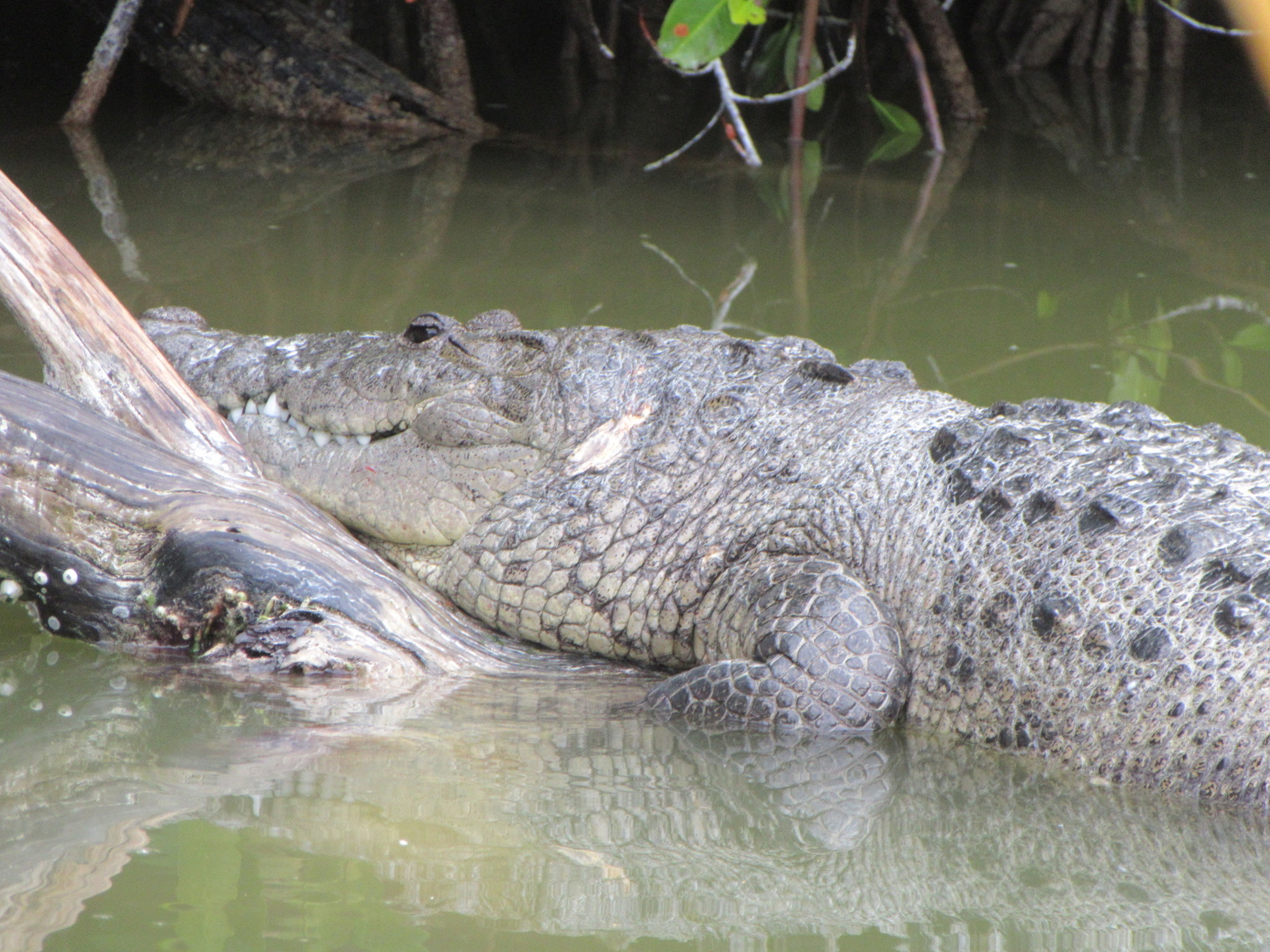Crocodiles ("cocodrilos") are also part of the system here, and Diego was able to sneak up on one. Actually, he paid no attention to us (the crocodile, that is). In Florida, in fresh water, there were thousands of alligators when we cycled in the Everglades, but crocodiles must prefer brackish water and we only saw a few. Here there are no alligators, but crocodiles, yes.