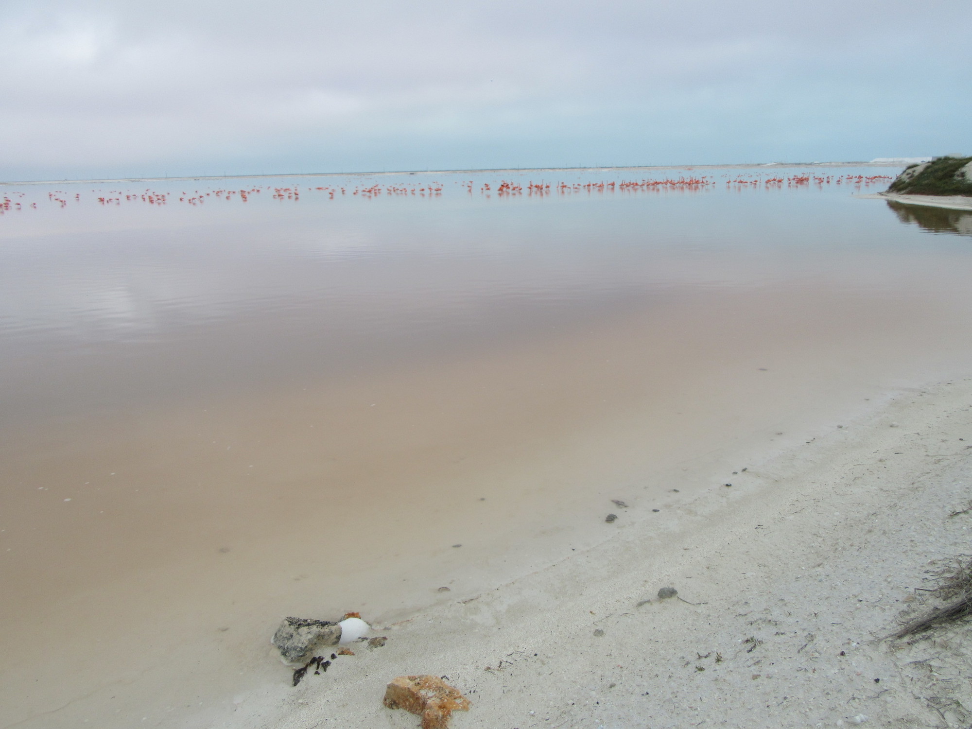 Normally, though we live by the sea, we are landlubbers. But look, Dodie seems to be quite the sailor here. The shot was taken as we landed on a sand spit, on the other side of which were the flamingos. We could hear them before we could see them. And we could see the pink water and its reflection in the clouds. This is caused by some sort of microorganism and contributes to the pink colour of the flamingos. The water is extremely shallow and salty here, and boulders of salt can be seen lying about. In fact there is a salt works, visible in the background. It clearly all contributes to a habitat that is good for flamingos.