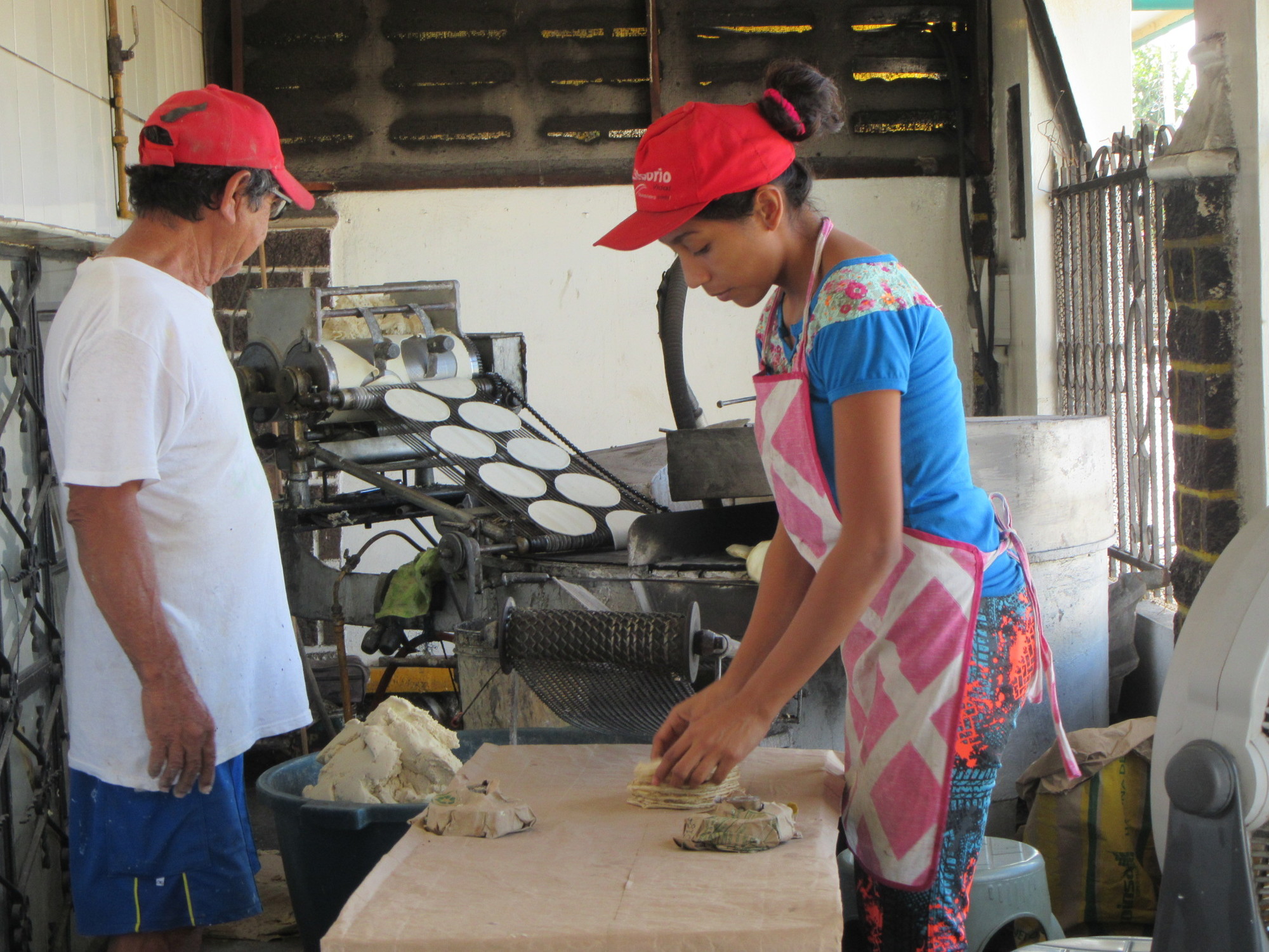 As we walked back to our room, we stopped in the tortilla bakery. The dough comes from a mixer and is formed into a sheet, then cut into rounds and baked in a matter of seconds in a gas fired oven chamber. The hot tortillas are sold by weight and deftly wrapped in paper. We got some hot ones - hot enough that our packet was hard to hold. How cool is that!
