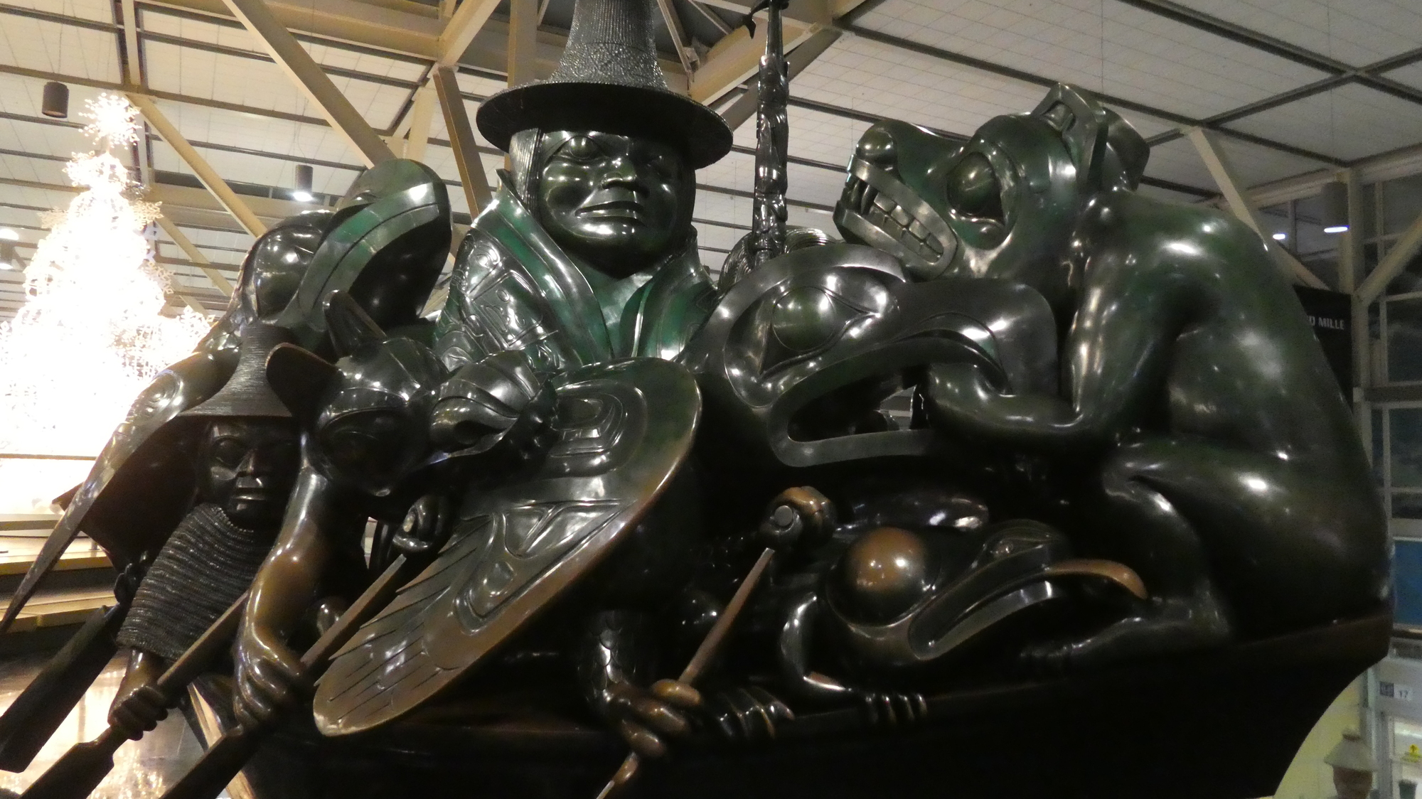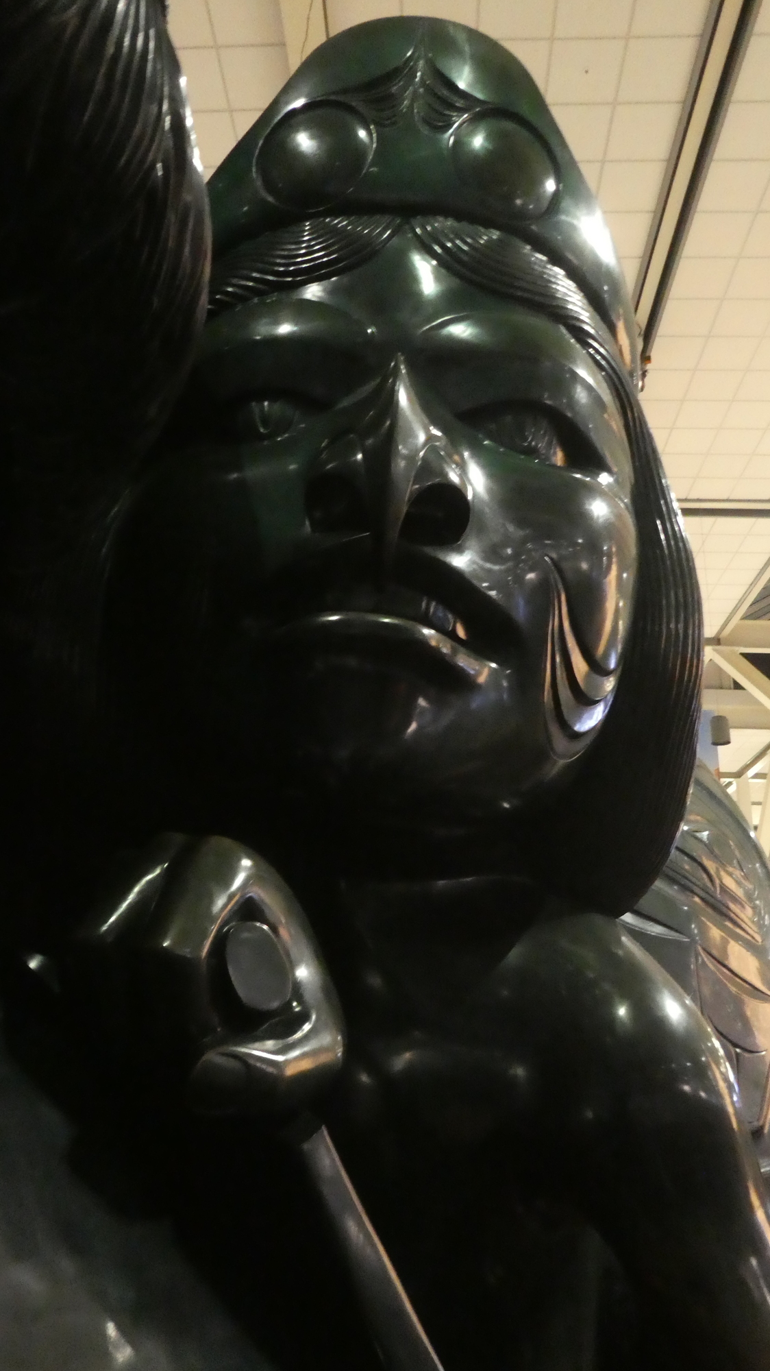 The Spirit of Haida Gwaii has two main installed versions - one at the Canadian embassy in Washington and one here at YVR. The Washington one is black and this one is green. One website claimed that while the black one is bronze the green one is fibreglass. To check on that was my mission. I stepped past the many "Do not touch" signs and gave the huge statue a quick "flicky". It resonated satisfyingly. So I can report to my brother that it is indeed bronze. I can also report that at "flicky" range, the statue is extra large and impressive.