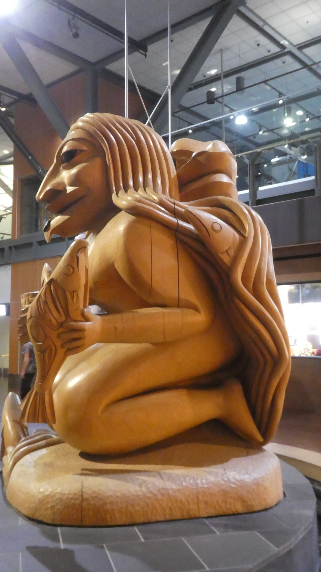 From the Spirit of Haida Gwaii I moved on to one we had not seen before. This is called Fog Woman and Raven. The back story is that Raven saw that Fog Woman had salmon, and married her for it. But Raven became bored and mistreated Fog Woman. So Fog Woman left Raven, taking away the salmon as well. Raven tried to find her, but she turned to Fog. Fog Woman still wanted the people to have salmon, so she returned them in the form of the spawning runs.