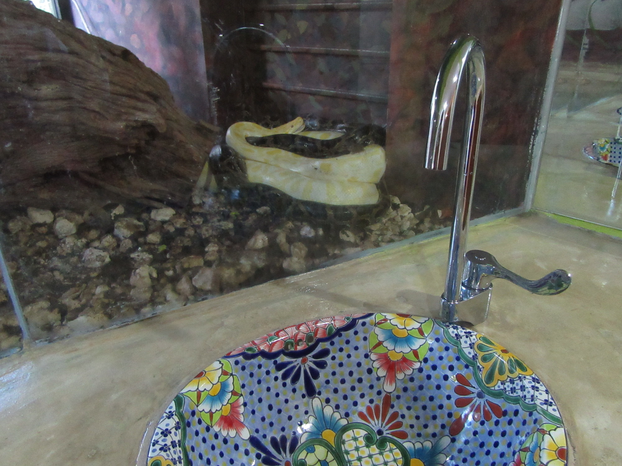 The Monkey Sanctuary is a very professional operation. Even their web site, on which we had made an advance booking, was right up to snuff in terms of shopping cart/point of sale type software. The buildings too were large and clean, and beautifully constructed. For example in the washrooms they were using the beautiful Mexican sinks, and as you stood before these, in the ladies', you looked at two Boa constrictors. In the men's, it was a very large tortoise.