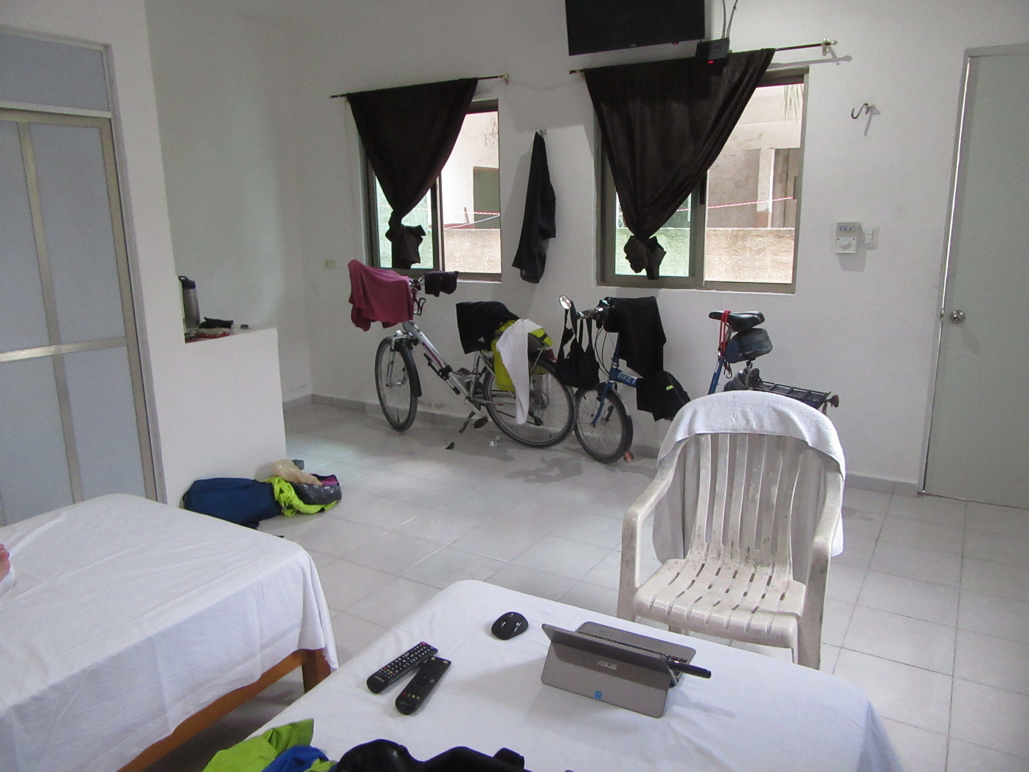 When I had looked at the place a day ago with the Google man, I declared it looked more like a construction or demolition site. That was true enough, but within the room was large and clean, with lots of place to put the bikes, and in this case hot water from an environmentally friendly "on demand" system. With fan, A/C, and reasonable lighting, we were encouraged to book for another night and plan a day at the lagoon.