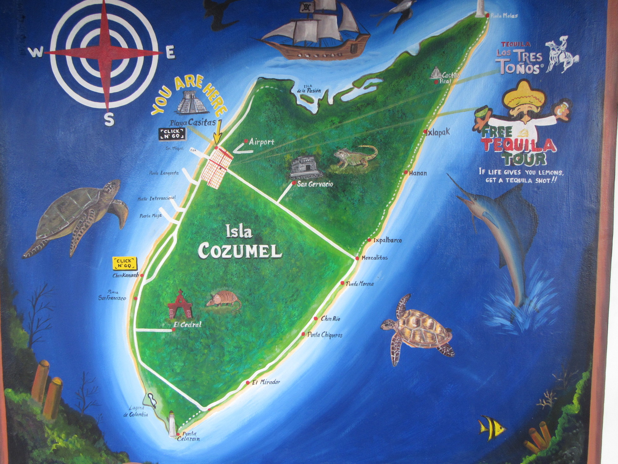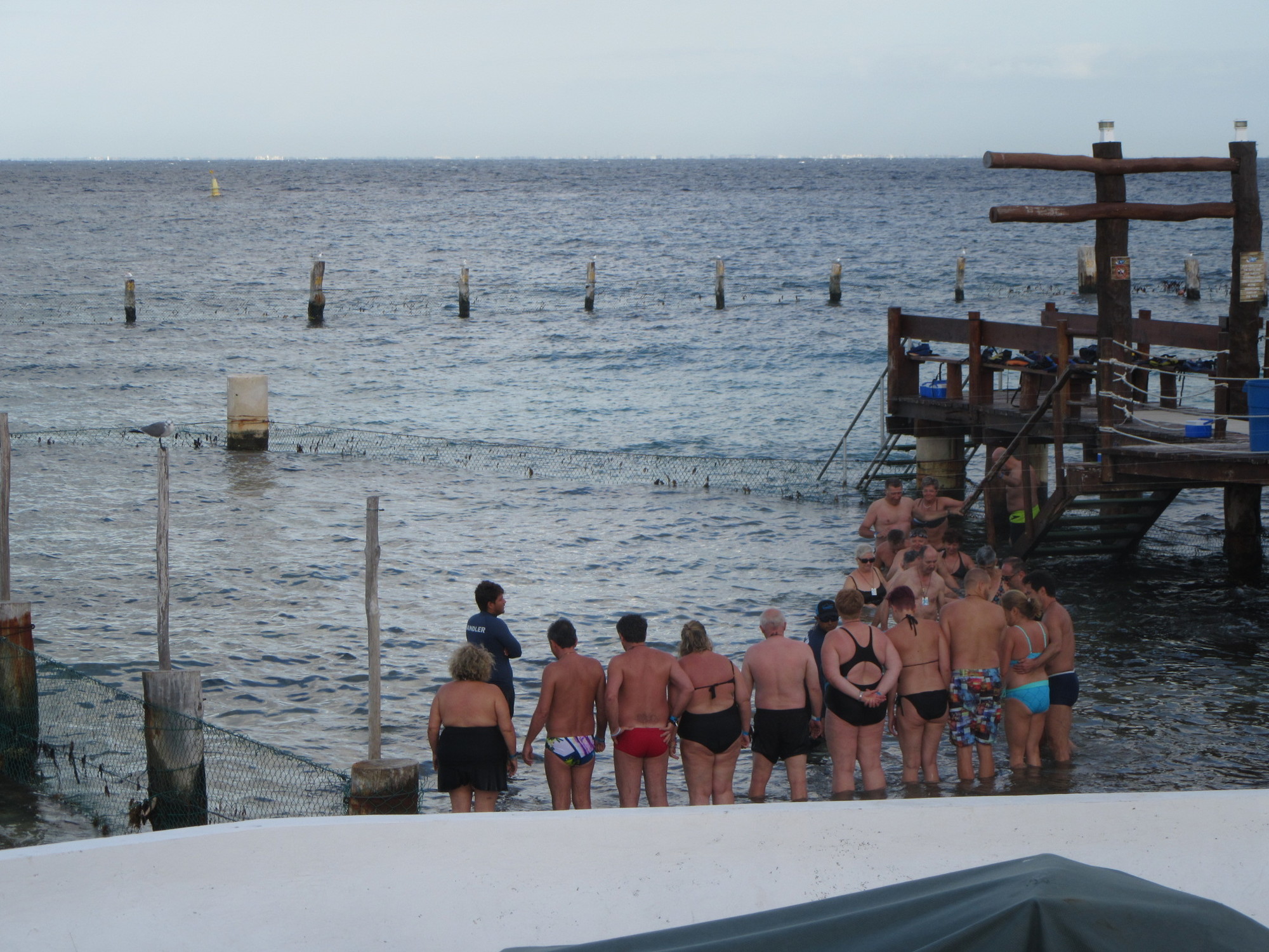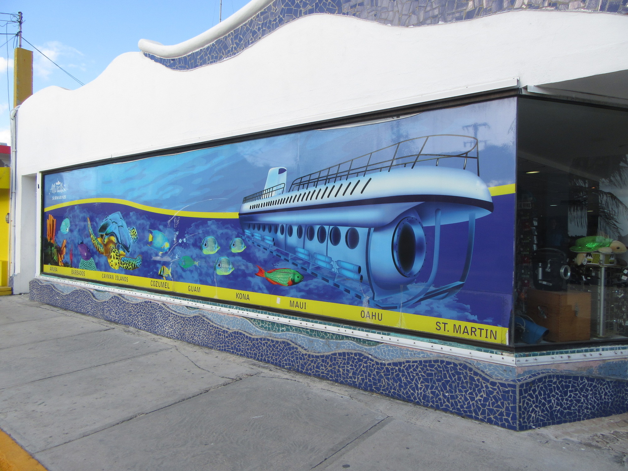There were activities laid on in that cruise ship area to keep the people amused. One was a chance to stand with sting rays, an admittedly iinteresting thing, that I had once done on the open reef in Cayman Islands. Another activity was cycle riding! But the identically equipped people would only cruise a few kms into town. Finally there was the miniature submarine. This too is inherently cool, offering a chance to go below the waves without scuba. The tour lasts two hours, most of which is used in boating out to the sub. The cost is 1890 pesos per person. That would be $250 for the two of us. Yikes!