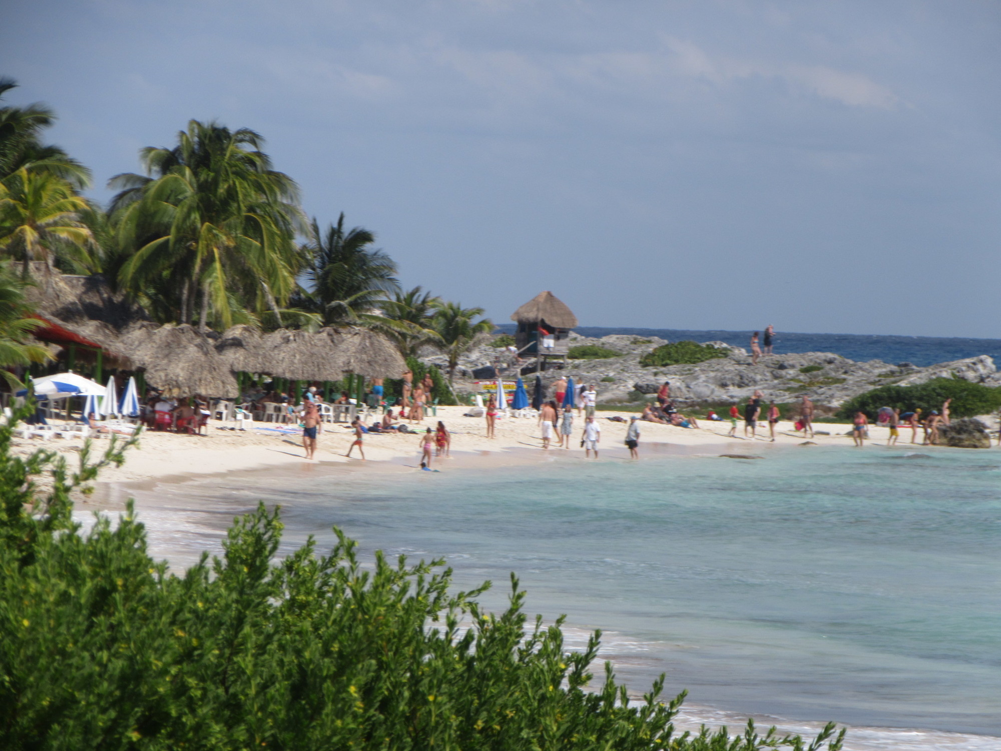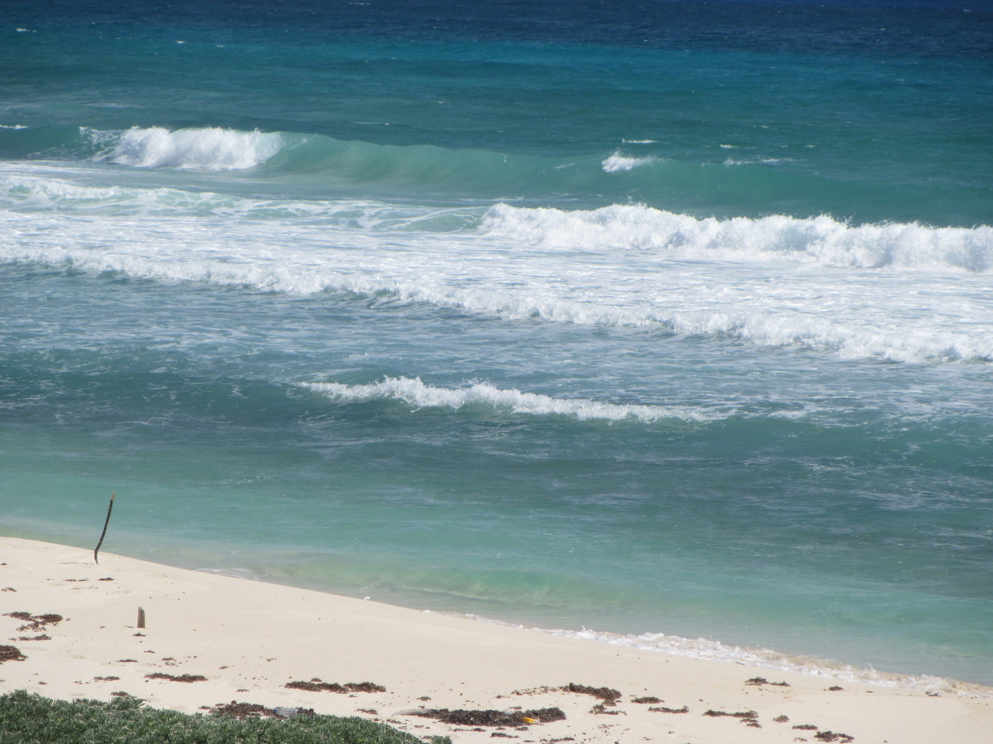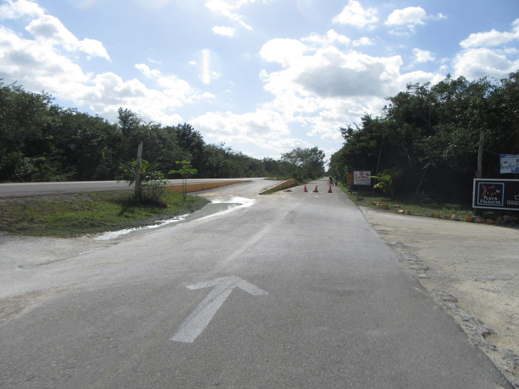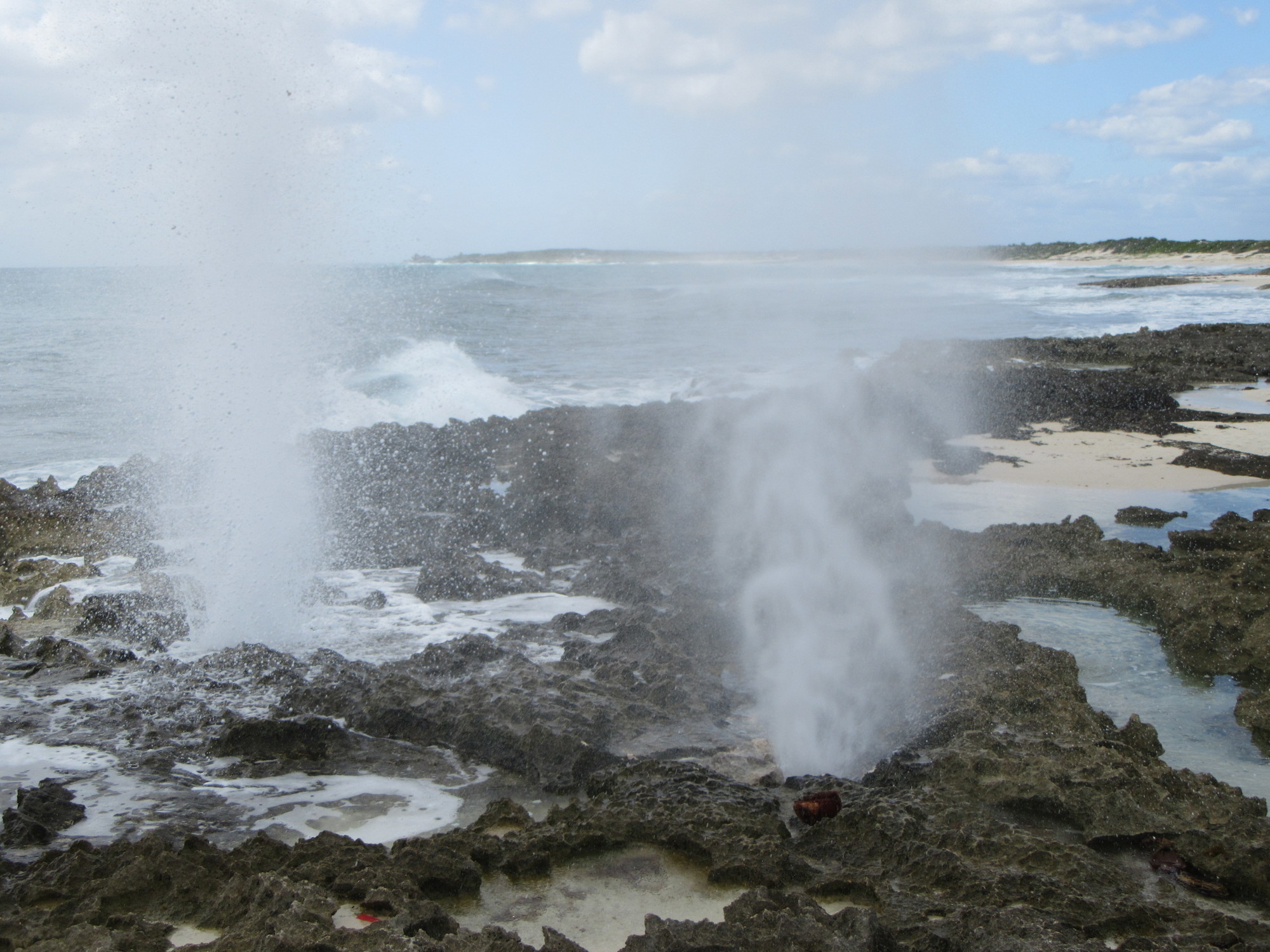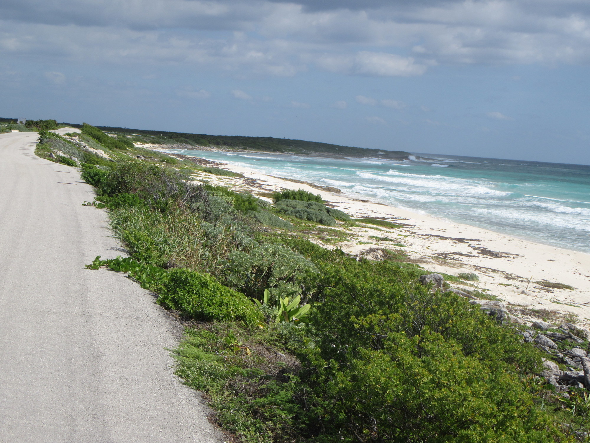 After Punta Sur the action really increased, at least in terms of the beauty of the ocean and the beach. Our road ran right along the shore, which often had long expanses of perfect sandy beach. But in other places the surf crashed into rocks, sending up spray. In several spots, the erosion of the limestone had created holes that erupted like geysers. It was all terribly exciting.