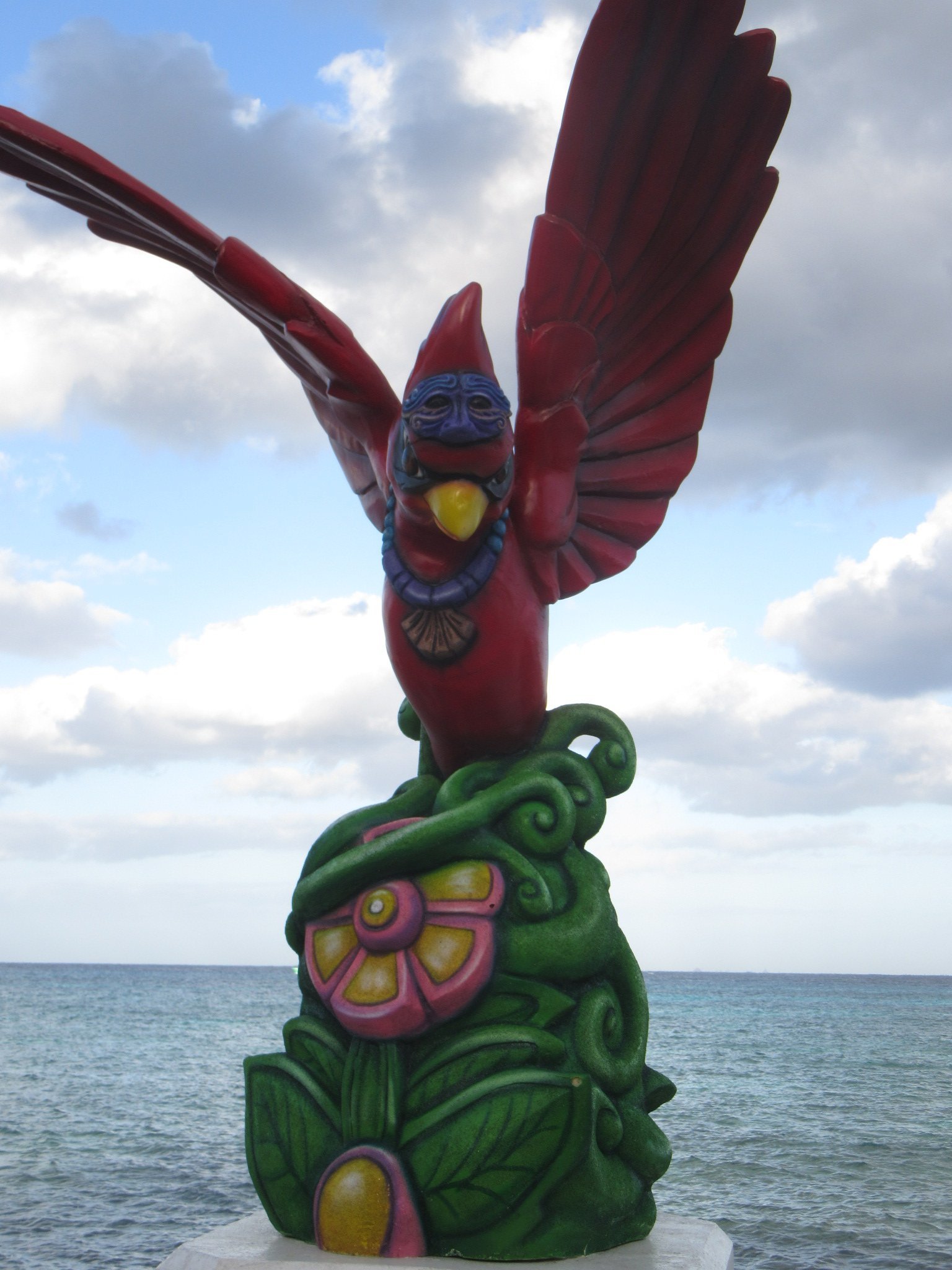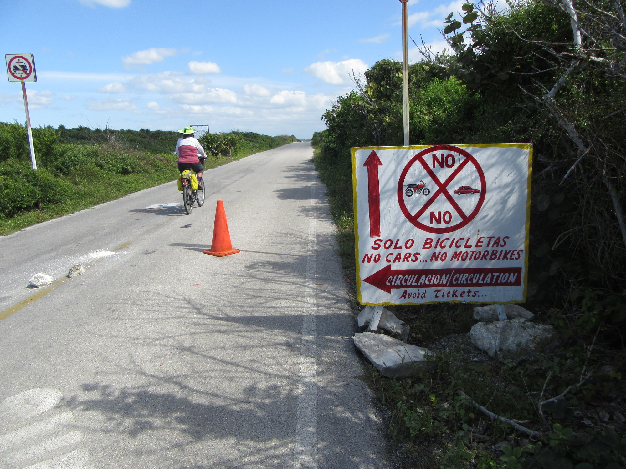 The bikeway continued, offering beautiful water views, down to the south point. Meanwhile the buggies and jeeps buzzed by on the motorway. At the south point is Punta Sur Park. This is billed as an "Eco Beach Park". Maybe in there the dune buggies can find dunes to tear up, though that does not sound very "eco". The cost to enter was $17 US per person. It did not seem like the right place for two little old Canadian cyclists.