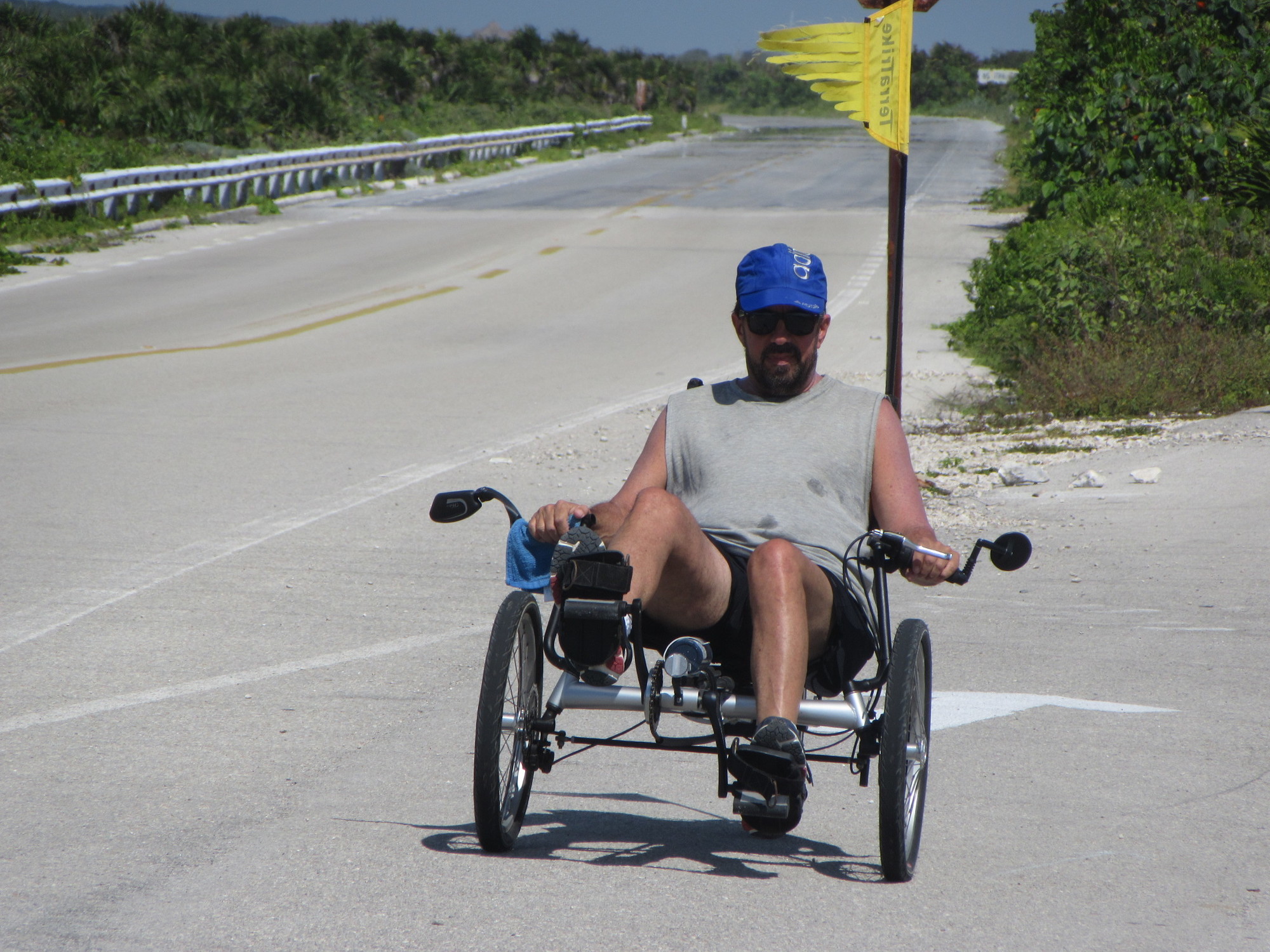 The first was a man riding a recumbent trike. Based on what we have seen, this could be the only one in Yucatan. The man explained that his left foot is paralyzed and would not be able to stay on a regular pedal. But with the trike he could strap it on. He still had two legs worth of power, since his left leg was ok. But the thing with this man (and his wife - on a regular bike) is that they will not tolerate being on road, at all. That makes this circuit perfect for them!
