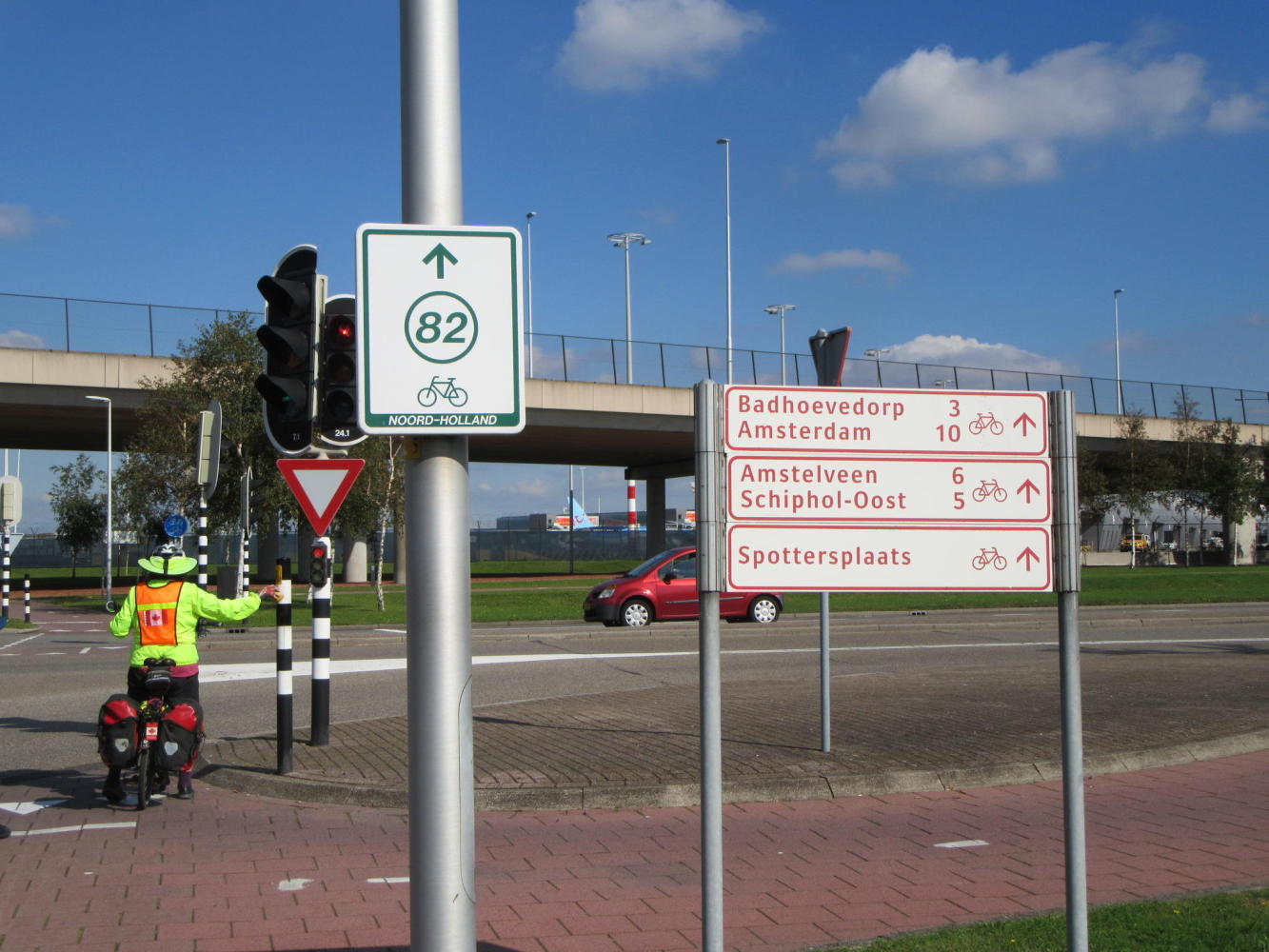 We arrived in Amsterdam suitably spaced out and jet lagged, but still managed to collect and reassemble our (undamaged) bikes. We found and followed the bike paths from the airport and arrived at the Ibis in Badhoevedorp. In its little snack bar we grabbed a burger and chatted with a young man from India who owns a company making and exporting material transport belts. We were able to learn a lot about how they are produced and marketed. In turn the young man learned much about our grandchildren and bicycle tours. I feel like we got the better part of the exchange.