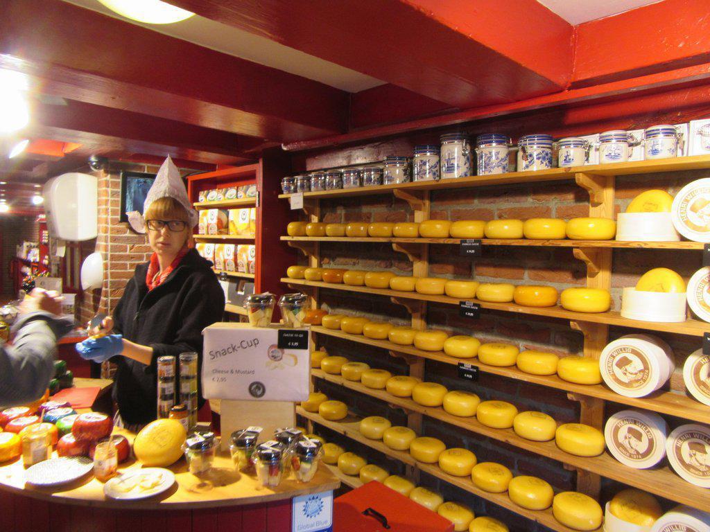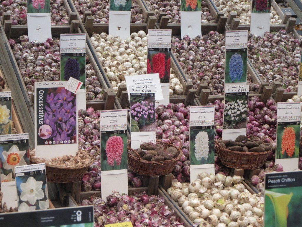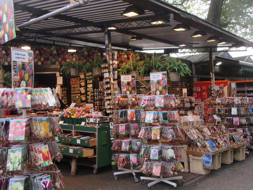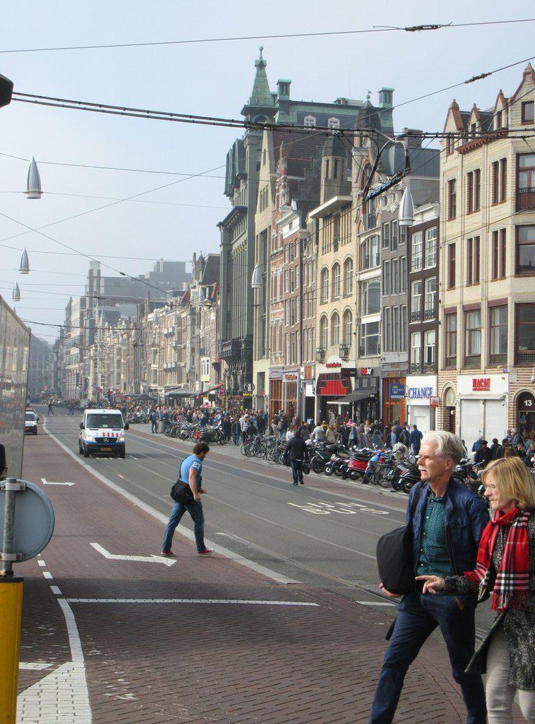 As we made our way into downtown, all the key features of Amsterdam rapidly made their appearances. These are the narrow buildings with contrasting brick facades and many windows, the many canals and the lovely scenes at the small bridges crossing canals, canalside roads which offer space mainly for pedestrians and bikes, but admitting a few beleaguered cars, parked bikes stacked up and filling racks all along roads, cheese shops, the flower market - comprising about twenty vendors along the Singel canal all offering quality tulip and other bulbs at reasonable prices, bakeries with good quality bread and danishes, lots of tourists, pedestrian shopping streets, even more tourists, and oh, did we mention lots of bikes?