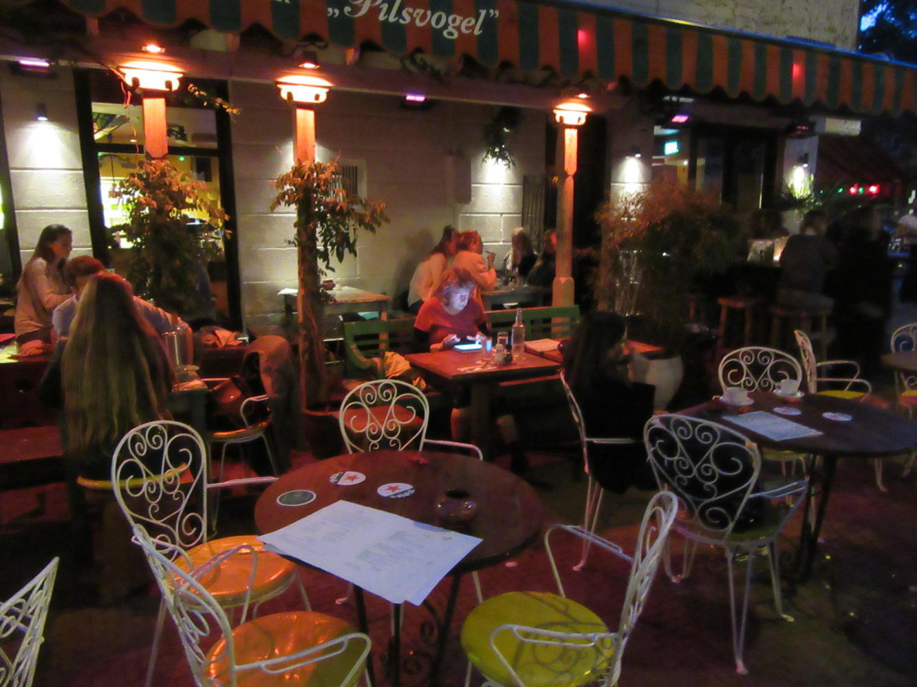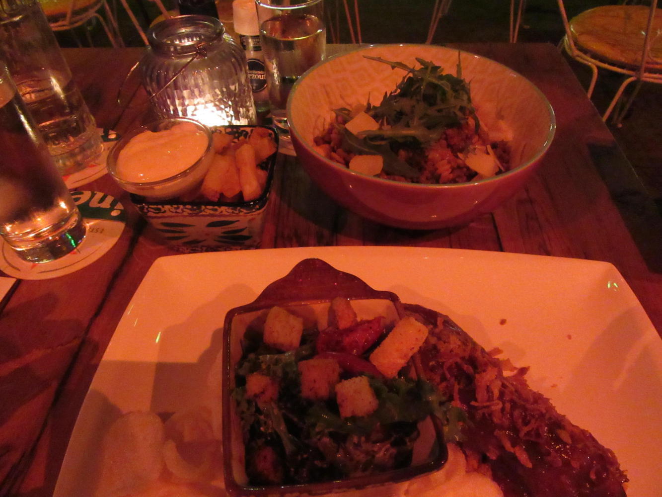 We walked back to that pedestrian only area to find a cafe for supper. "Walked" is actually a big word here, because Dodie did it without sticks. Earlier in the day we had searched out and found an Indonesian restaurant recommended by the Alstons, but it was closed. So finding Indonesian was still on our minds. The closest we came was a restaurant with sate on the menu, and it turned out to be excellent. Dodie ordered a lamb on pasta dish which was also excellent. From our small sample we might be ready to say that both bakery and restaurant food is better here than in France - and as we know both of those are super in France.