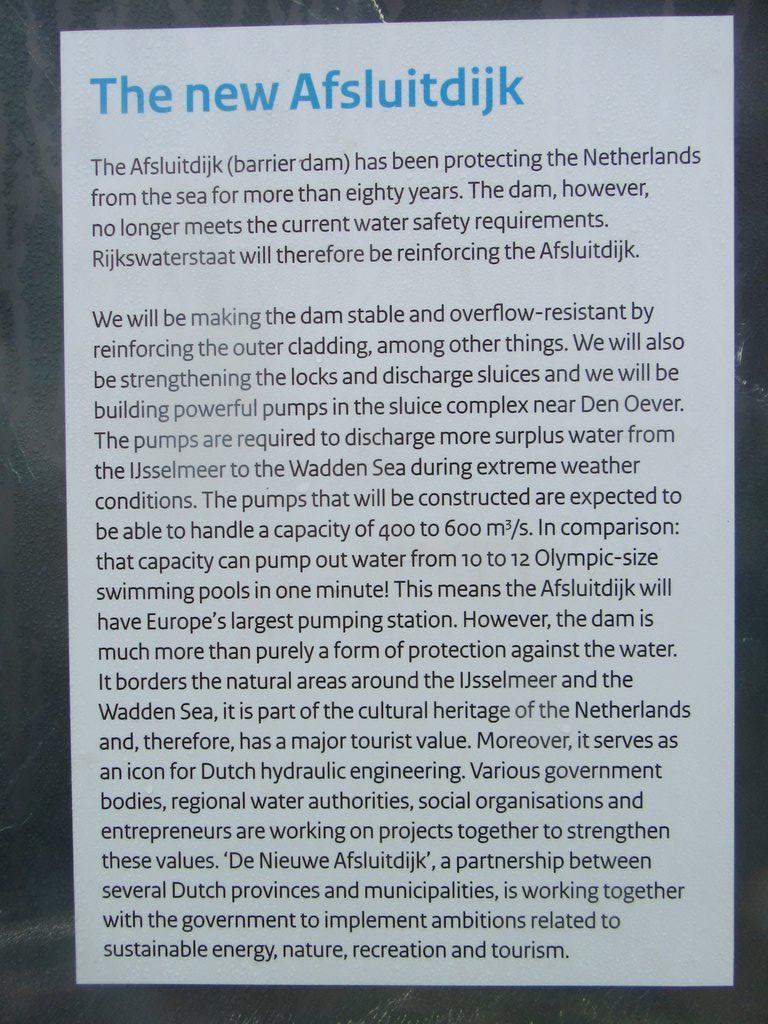 1/4 of the way along there is a monument for Cornelius Lely, the minister of transport who pushed through the dike project. Construction was in the 1920's. Now a new project is in the works to raise and strengthen the dike. They did not say if this was due to global warming or just to the fact that the dike is coming up to 100 years old. The updates will include more powerful pumps. The new system will have a capacity that could empty 10-12 Olympic sized swimming pools in one minute!