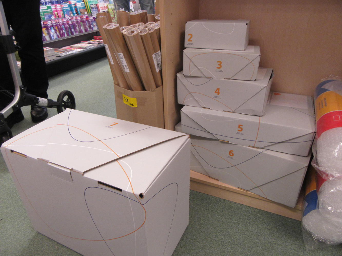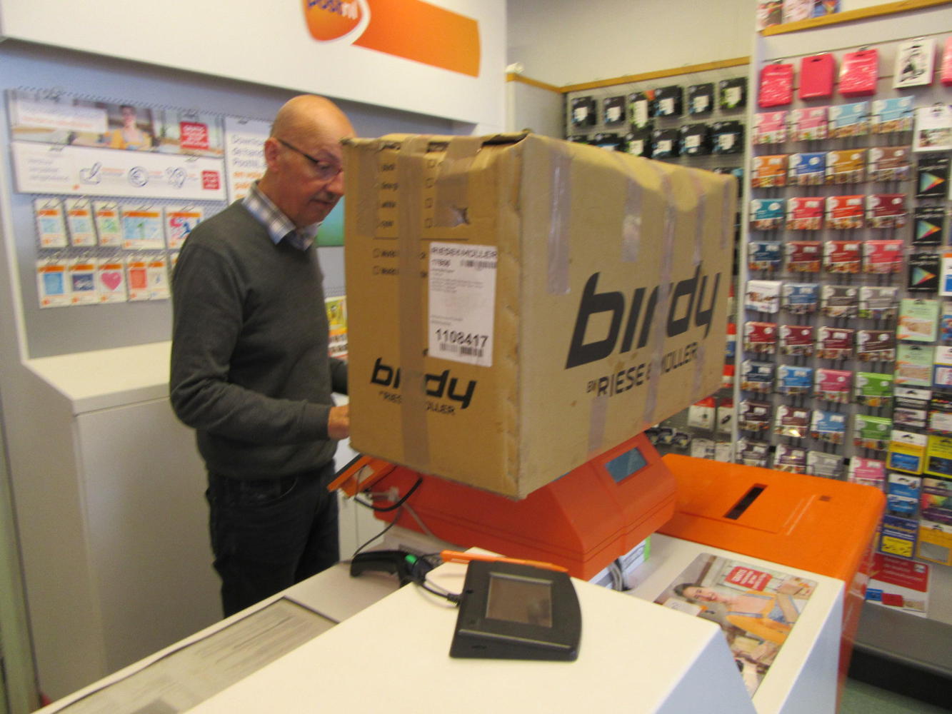The bike shop did a great job of compressing the Friday into the maximum 40"x20x20 box. They actually adapted a box from a Birdy - the German folder. We had a bit of an open coffin viewing, and then the thing was sealed shut. I had hoped the shop could lend me a real Dutch cargo bike for the trip to the post office, but none was available. So I just grabbed the box and trudged it over.