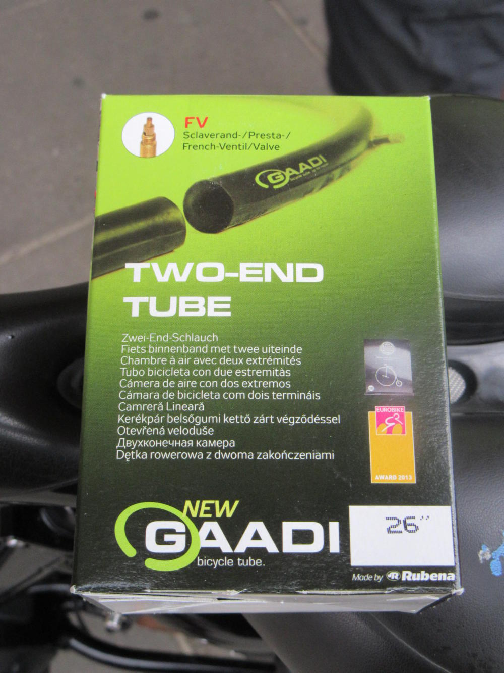 All this is totally old hat to Dutch people. 98% of gearing here is rear hub, making it more of a bug to remove a wheel. Or maybe it's just what you are used to. Maybe Dutch people would want to dream up any way possible to avoid flexing a derailleur arm and fighting the chain over the cassette? Anyway, we stocked up on these cuckoo split tubes, Slime, and such.