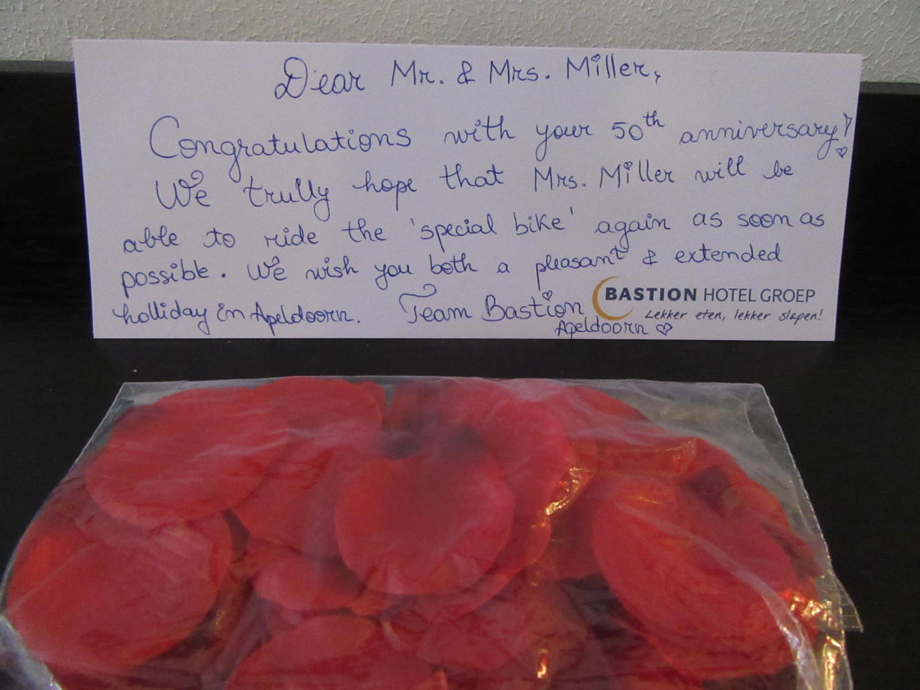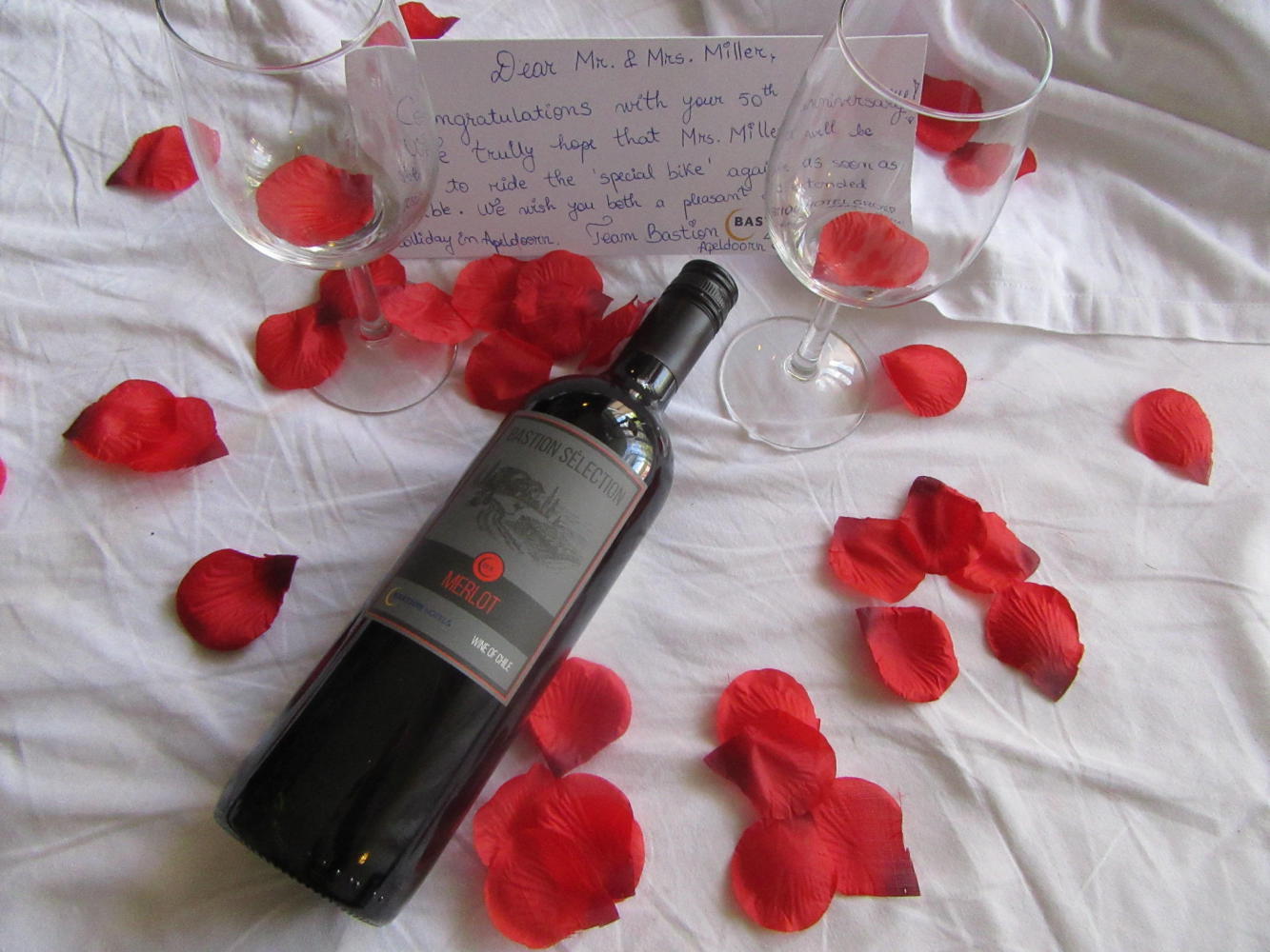 Walking deeper in we were surprised, very surprised, by our bed strewn with silk rose petals, and with a bottle of wine, two glasses and a note. It was a happy anniversary greeting from the hotel staff! So nice.