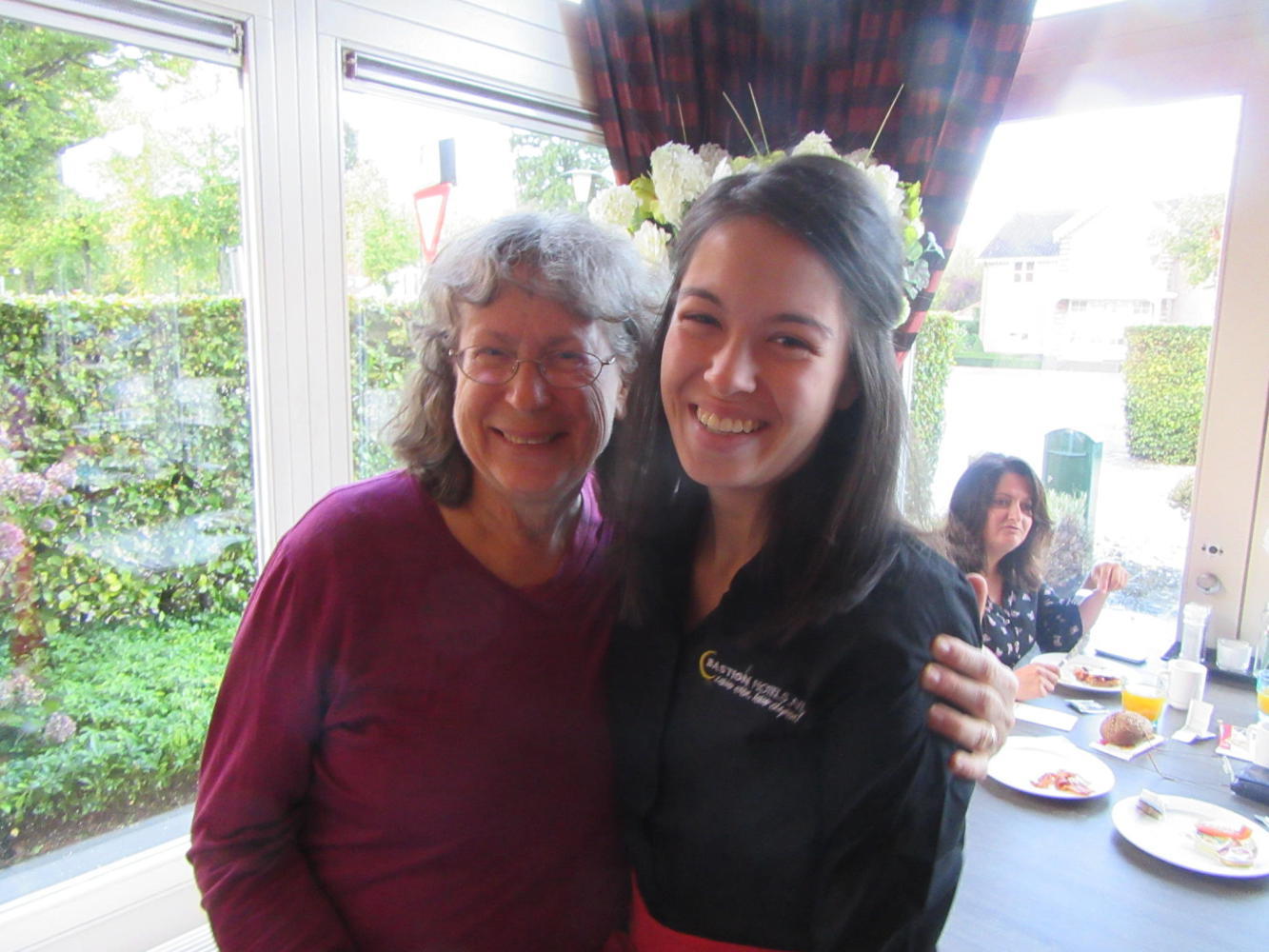 A lady then left the group, not in response to the photo but on seeing us strangers in our goofy yellow raincoats. She came up to us and invited us down for a coffee. After a brief chat she excused herself, I think because English was a bit of a strain, and handed off to a young girl to occupy us. I found that she was 18 and had just gone to begin medical school in Nijmegen. But since this was the weekend, she was back at her parents' place in Apeldoorn. Her father is a hematologist, bit she said she would rather work more directly with people. She has a 6 year program ahead of her before going into a specialty.