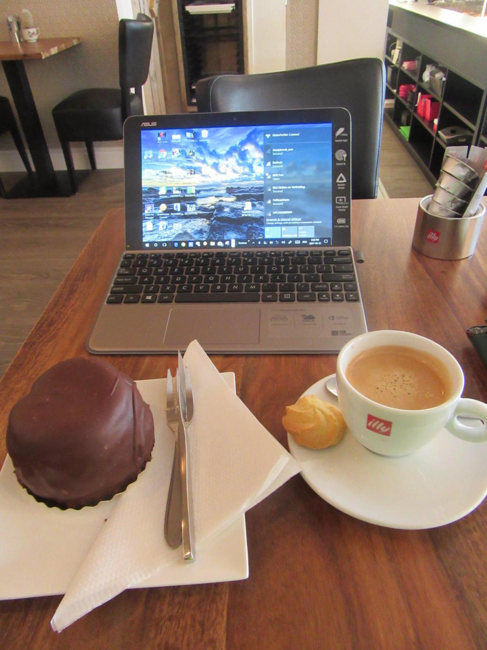 I followed this up by going to "my" patisserie, which I have determined is actually the only patisserie in town. Other bakeries are ok, but they feature what can be uninspired buns and apple cakes. Again, just to change things up, I sat at a table in the patisserie rather than getting a take out, and I added an Illy coffee. Illy is very famous and expensive. It tasted fairly normal to me.