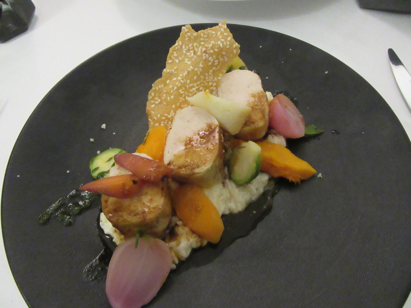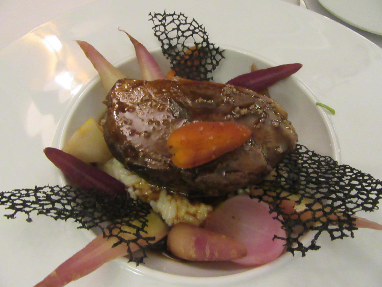 The Ibis we are in is somewhere out of town, surrounded by parkland. So the only food choice is the hotel restaurant, which it turns out (surprise) is a French restaurant. Avoiding the foie gras and unfamiliar fish choices, we went for veal (cooked, they said, 36 hours) and a ballotine of chicken. Ballotine is chicken breast or thigh pounded thin and filled with something, in this case seemingly more chicken. At first I was lamenting the absence of good old schnitzel on the menu, but both these dishes turned out to be extremely well prepared and very yummy. 20 euros each -- hmmm. We have gone upscale from our lunch of apples and cookies.