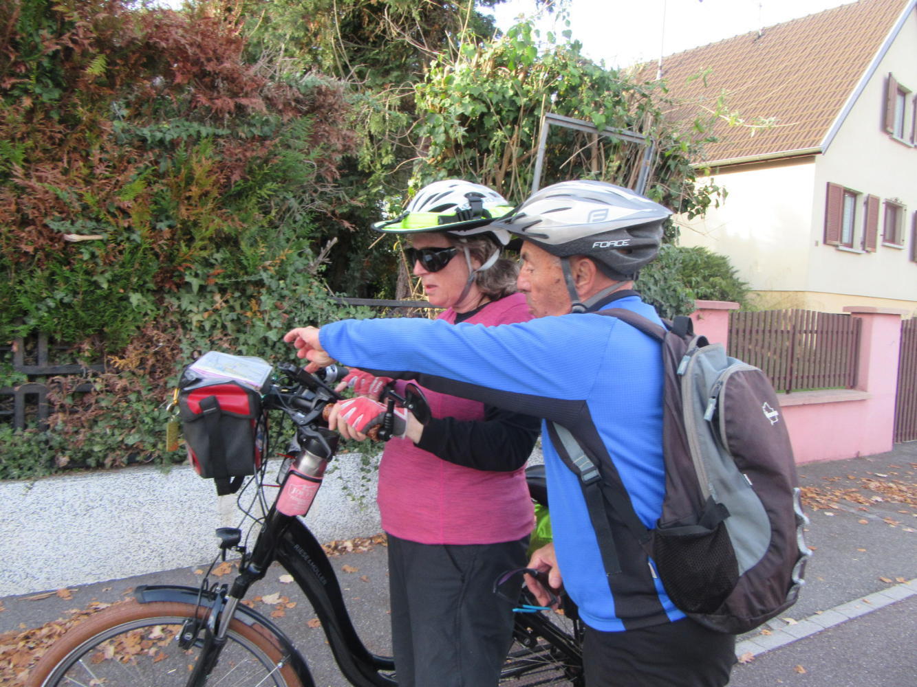 Now a road angel appeared, in the form of a man on a bike - we never did get his name. He lived in the next village, and confirmed that we were not going to get to Mulhouse this way. He had a few suggestions, but he could see they were complicated enough that he had better guide us.