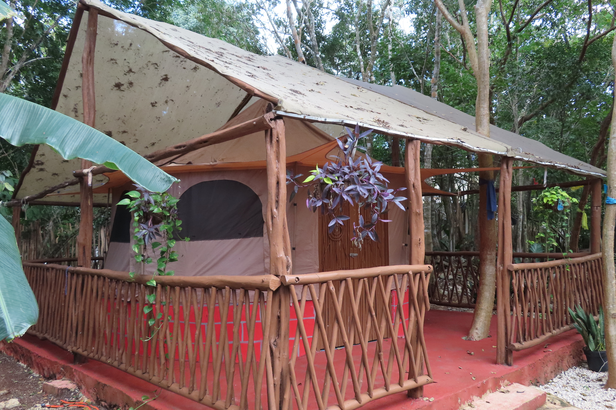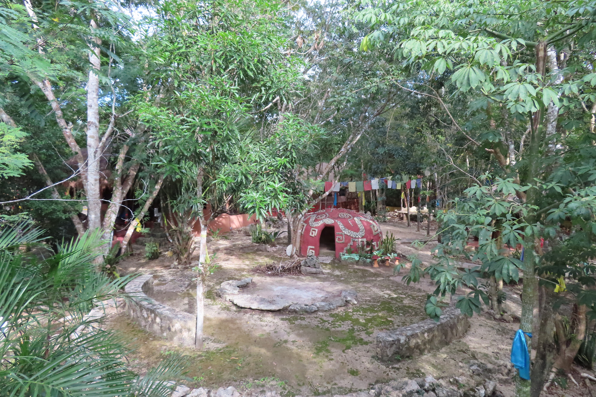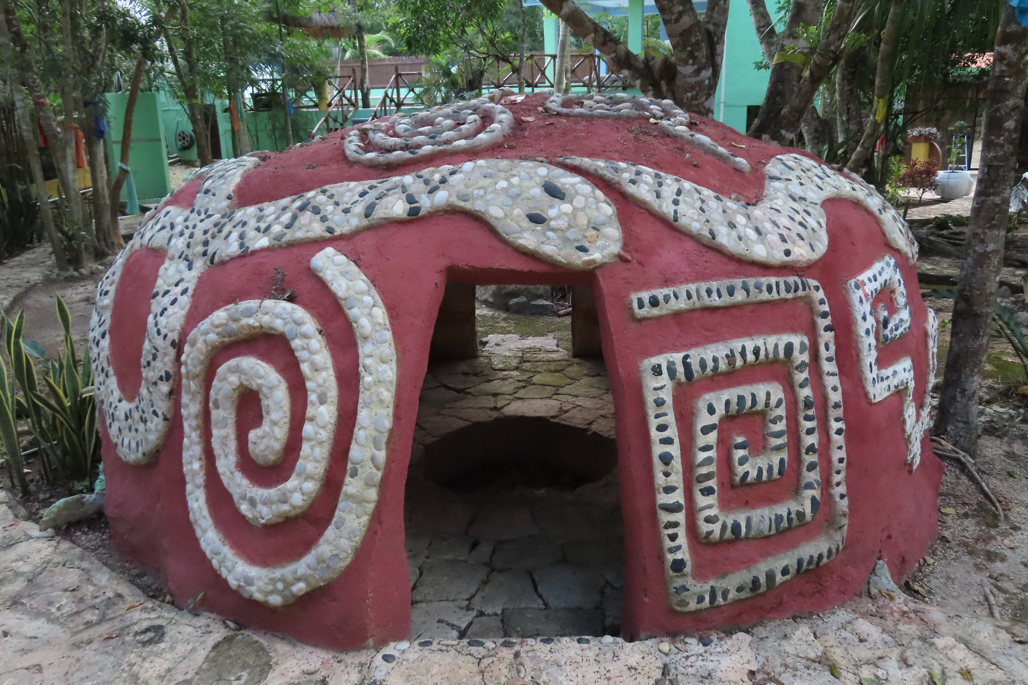 Eventually we reached the super tiny Tres Reyes, and turned off into the jungle for a short bit. Our road ended in front of what we assumed was our booked accommodation - at a place called Ka'an Serenity. It was a walled enclosure, with a beautifully carved door. We rang a bell and a man came, but looked puzzled when we announced our name and why we were there. He went away, but fairly soon another man arrived on a motorbike. The short story is that this was indeed Ka'an Serenity, but they had no Booking for us, despite the fact that we had paid in advance though Booking, last month. Out here in the jungle, there was no service on our phone, so we could not phone Booking to see what was going on. But man #2 told us they had cancelled their Booking affiliation last month, because of the too high fees.