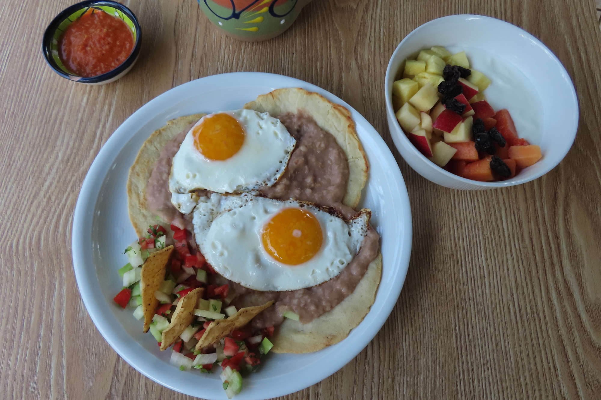 The real show began only at 8, when our hosts brought out breakfast for us to eat in the palapa in the garden. Dodie got the yogurt and fruit, and was happy with it, but I think my egg plate was really super. The little pancakes at the bottom were thin and a little crispy, like crepes, so I suspect it was the Swiss born host that prepared this, rather than his Mexico city born wife. Another clue to this was that she had time to chat with us, prior to the appearance of breakfast.
