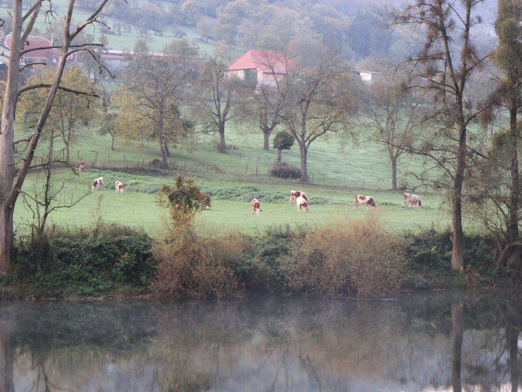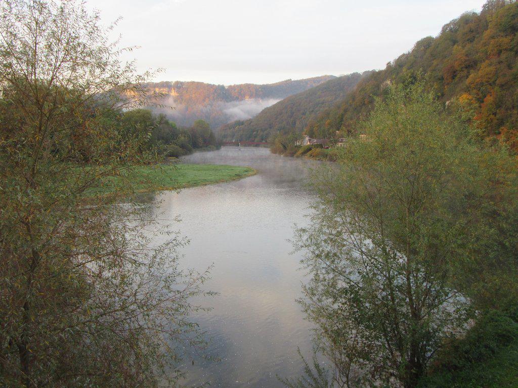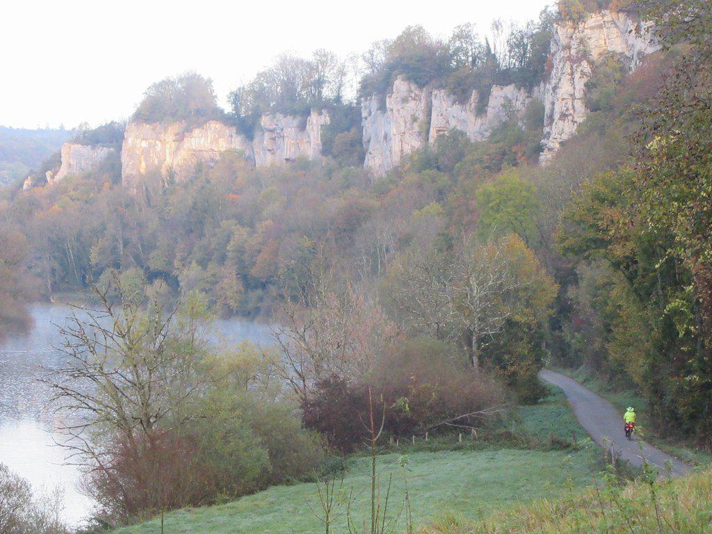 From Baume les Dames to Besancon EV6 follows the Doubs river as it passes below rock cliffs. There are a few spots where we were on road, but overall it was a relaxing if frozen ride. Part way through something about the temperature caused a fog or mist to descend on the river, and we found we had to put on our lights for safety. The cold and foggy appearance of things was very wintry, and I found myself thinking of warm, interior!, Christmas things.