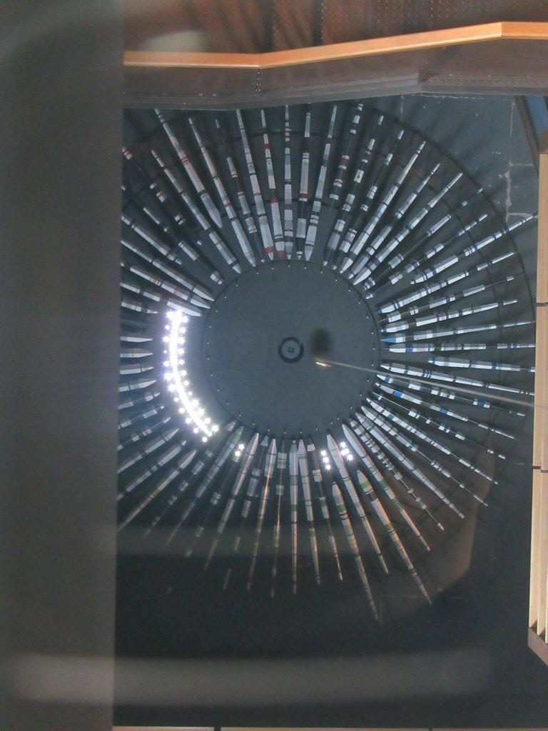 Following the astronomical theme, the museum also housed a rather amazing thing - a Foucault pendulum. This is a brass ball suspended from the peak of the building on a 13 meter long steel cable, forming a pendulum. Following the idea of physicist Leon Foucault from 1851, the pendulum is made to swing back and forth, just above a horizontal circular dial. Now a pendulum it turns out always swings in the same plane as how it starts. But if you observe the ball passing over the dial for long enough, you will see it passes over progressively different sections. That is because the earth is spinning beneath the pendulum! At the latitude of Besancon, the circular dial will revolve under the pendulum completely in 32 hours. At the North Pole, it would be 24 hours. Got that?? (We didn't).