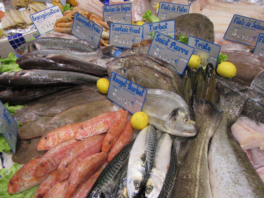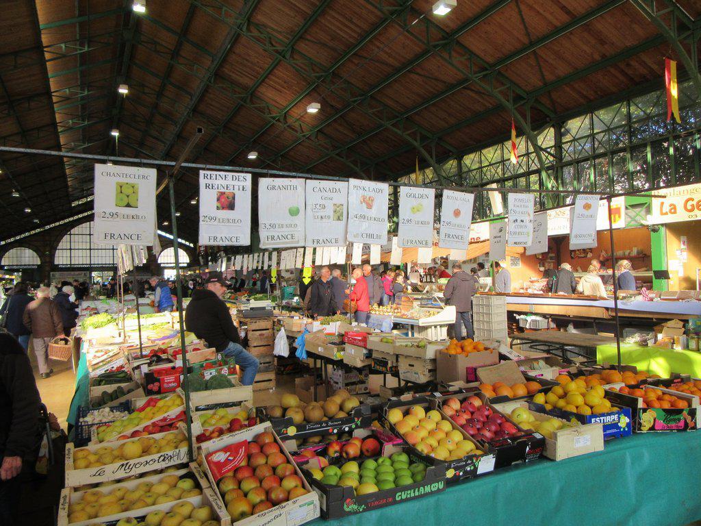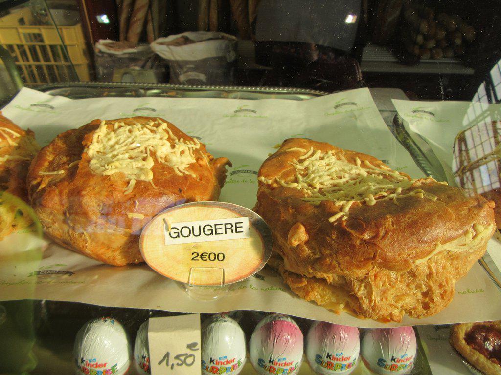Inside the market building, there were the now expected multiple bakeries, butchers, cheese stalls, fruits, and vegetables. This one stood out, though, because first of all the bakeries had two local specialities. The one is called gougere, and had been mentioned to us at Les Bains. It's a choux pastry with gruyere cheese through it. Super yummy. The other is brioche with praline rose. This is a regional specialty that we really got into in the Spring, after Michel from Nantes had got us looking for it.