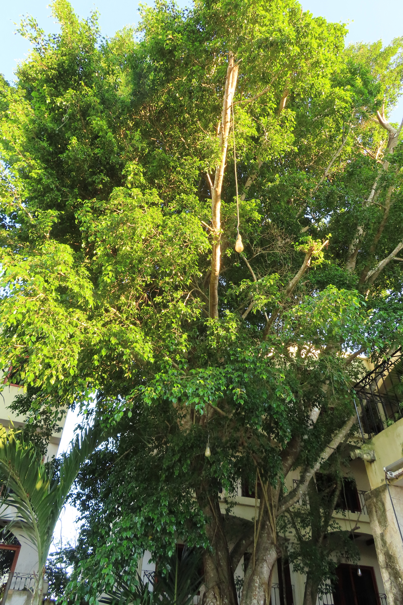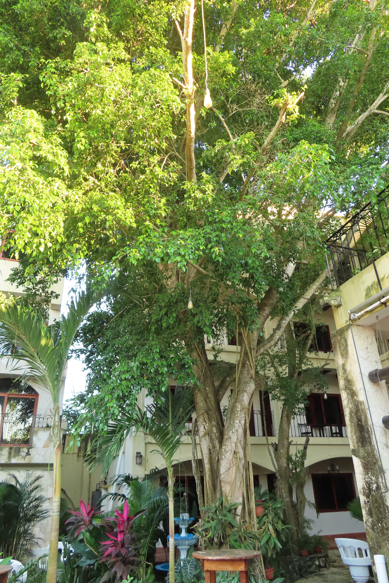 There is a huge jungle type tree growing in the middle of the hotel. Birds are screaming up in this tree. Merlin hears them as the Melodious Blackbird, Great-tailed Grackle, and Brown Jay.