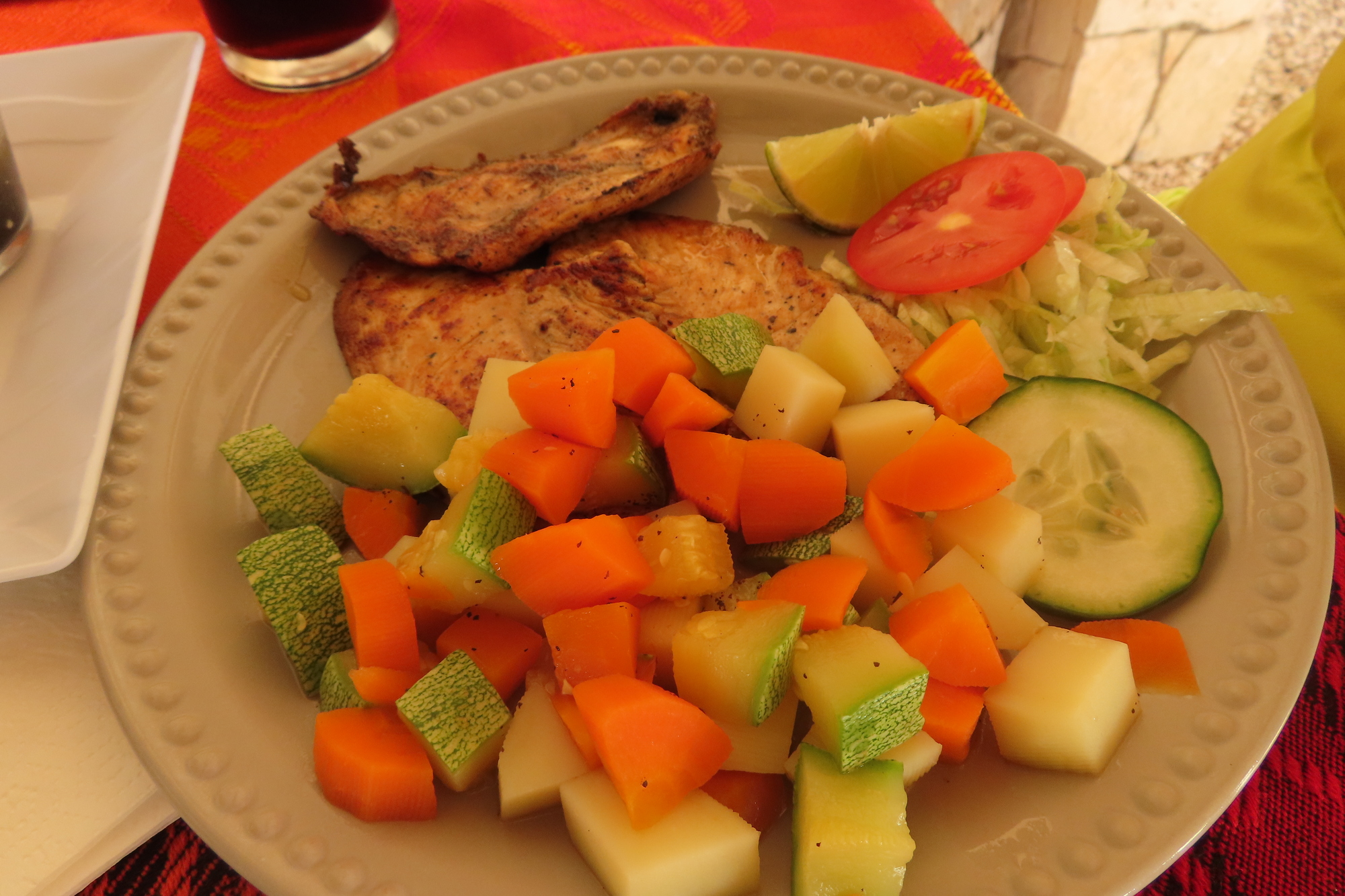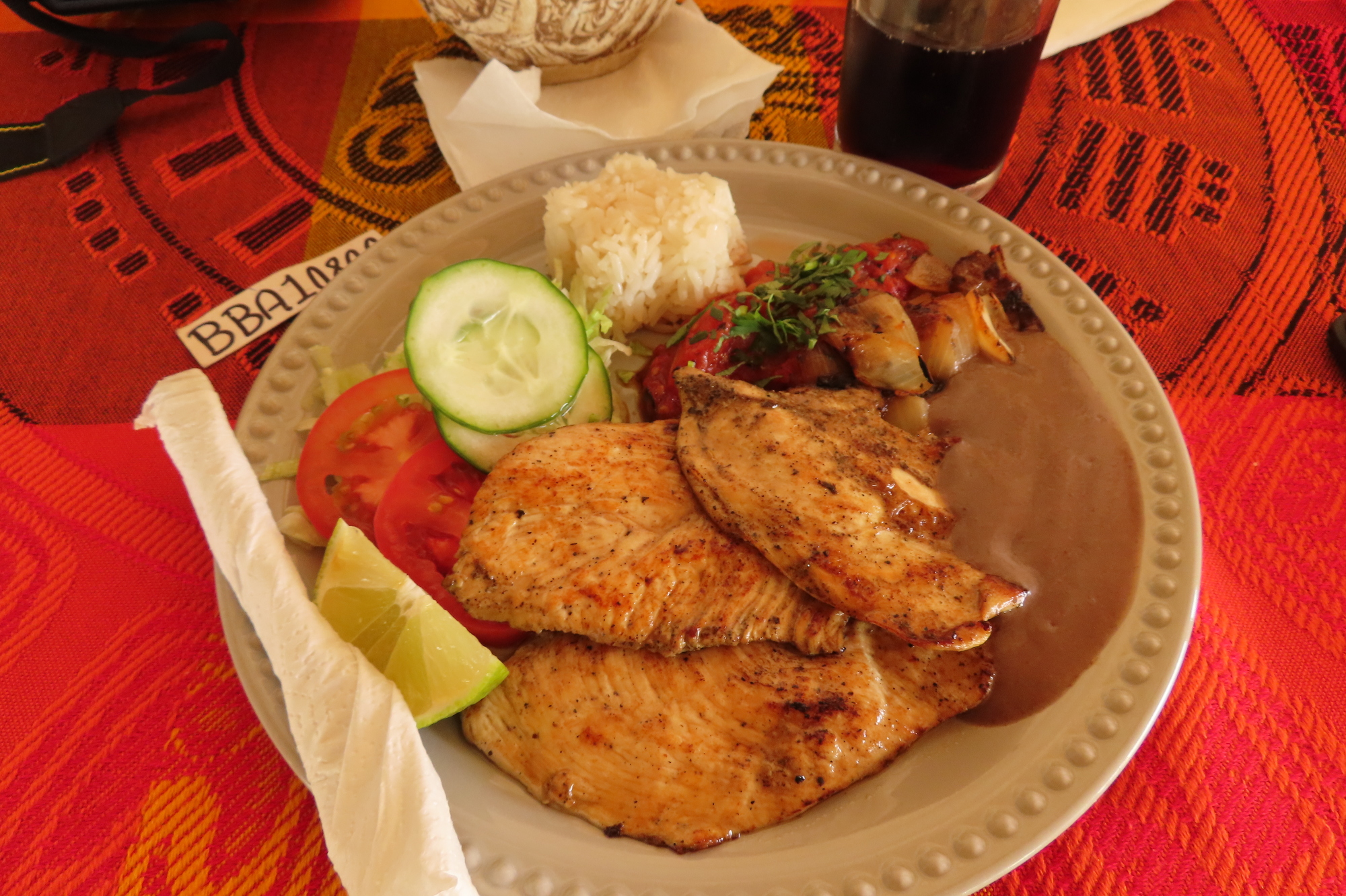 Dodie chose a similar chicken (only not marinated in bitter orange) and really nice cooked vegetables. We also went crazy and split a coke!