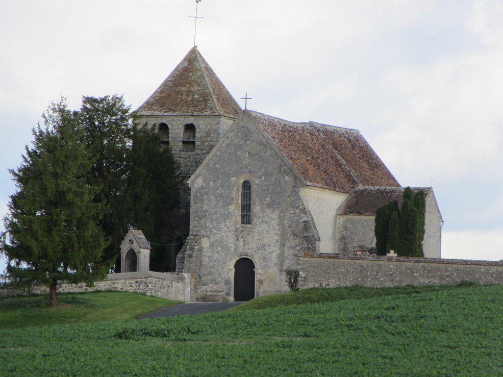 The canal path started off paved but pretty soon devolved to gravel of various degrees of roughness. The rougher the gravel the greater our effort and the lower our speed, of course. Eventually we got fed up and decided to take a parallel D road. It was not totally easy to escape the canal, but we found a little laneway and eventually made our way to D40. We took that through La Genevraye, only occasionally being worried by a too fast or too close car. At Genevraye we were rewarded with a nice scene of a medieval church on a hill.