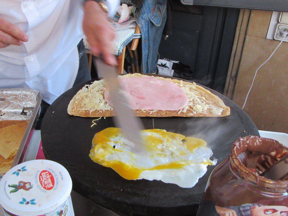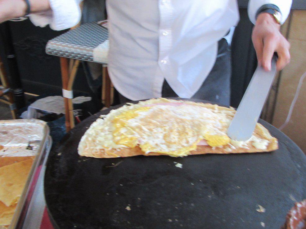 Out on the street we went looking for a place to eat. There were lots of choices, but somehow we were attracted by the simplicity of getting a crepe from a stand set up outside a restaurant. There were options for sweet crepes, with Nutella, or Bon Maman jam, or chestnut crème, but since this was supper we were interested in the ham and cheese variant. I decided to go whole hog and have an egg thrown in as well. Dodie cautioned me that since this was France the egg would not be "properly" cooked. "No problem", I countered, "I will just ask the man to cook it properly". "You will embarrass me and besides there is not way that is going to happen". "If you order it, I'm insisting that you eat it, no matter what!"