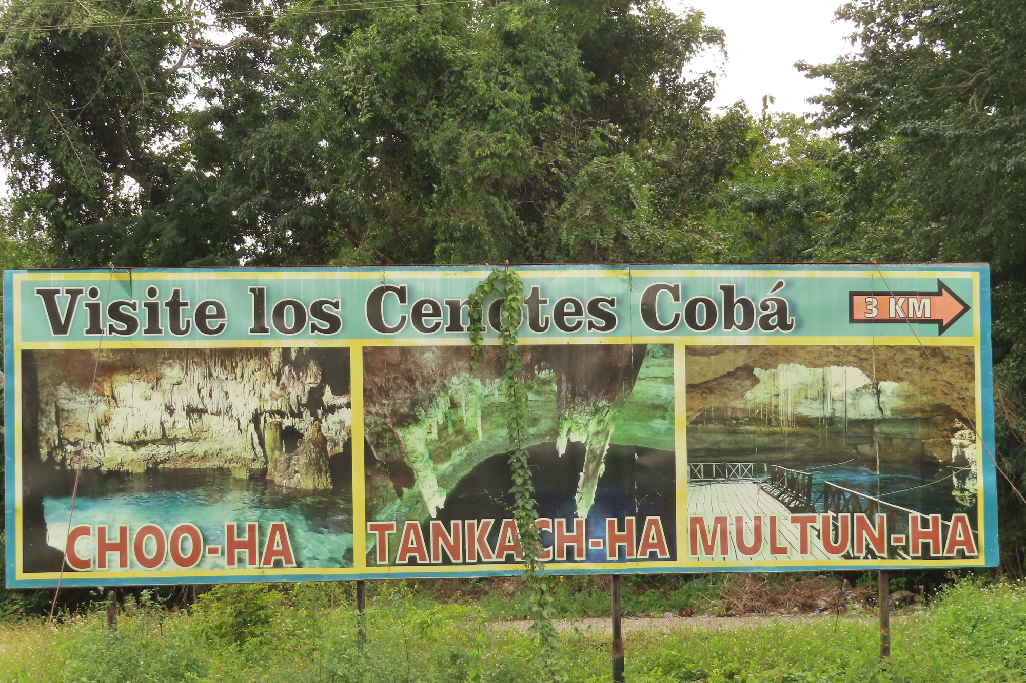 We were also eager to get out to the cenotes. Coba has three famous cenotes, that you can see from this roadsign: