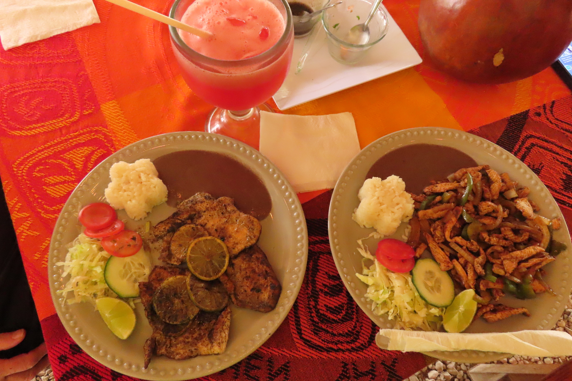 I went for chicken fajitas, while Dodie chose chicken breast with garlic and lime. Again, these had the usual accompaniments. We also went crazy this time, with me getting a whole Coke, and Dodie the pictured watermelon juice. The hollow coconut in the corner also contained a stack of tortillas.