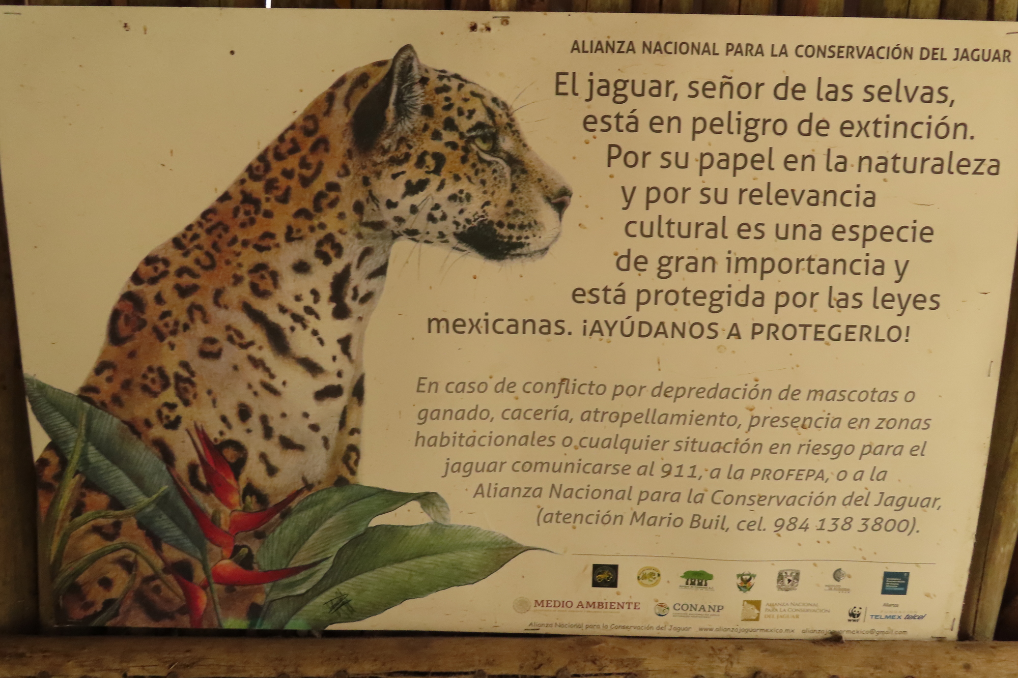 Another aspect of local culture is the respect for the Jaguar. Here is a sign supporting their conservation: