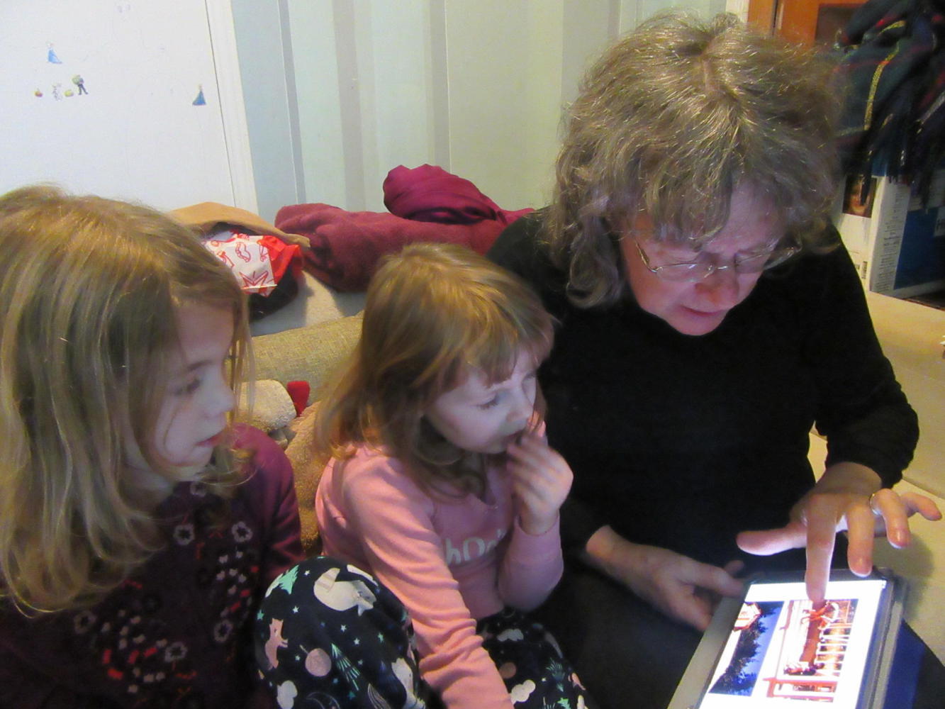We had time today to go through some blog pages with the kids. We are gratified by their interest in them. It was also great to see Joe playing with his knight and horse and to see how chic Amelia looked in her Paris outfit, heading off to school. Evee was sick today and sat on Dodie's lap most of the time.