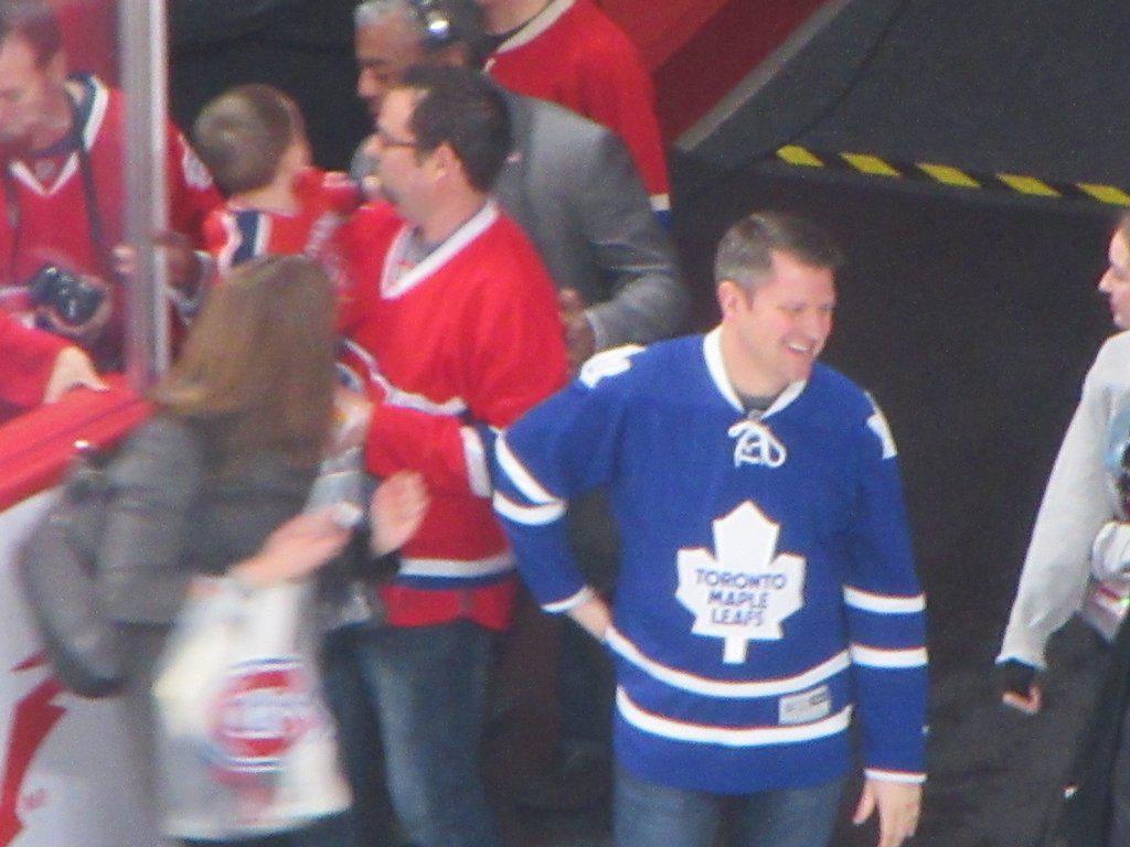 Very quickly though, the signs of change were apparent. We were in Schwartz's and indeed all was as before (except for Celine on the placemat). The place was of course full, but with the early hour and cold temperatures outside, there was at least no line on the sidewalk. Among the customers were those in hockey sweaters, since clearly we were not the only ones who planned to come here and then take the Metro to the rink. But among the sweaters was a fair, even an equal number of Leafs sweaters. And later, at the rink (Bell Centre) , there was also an equal number of Leafs sweaters.