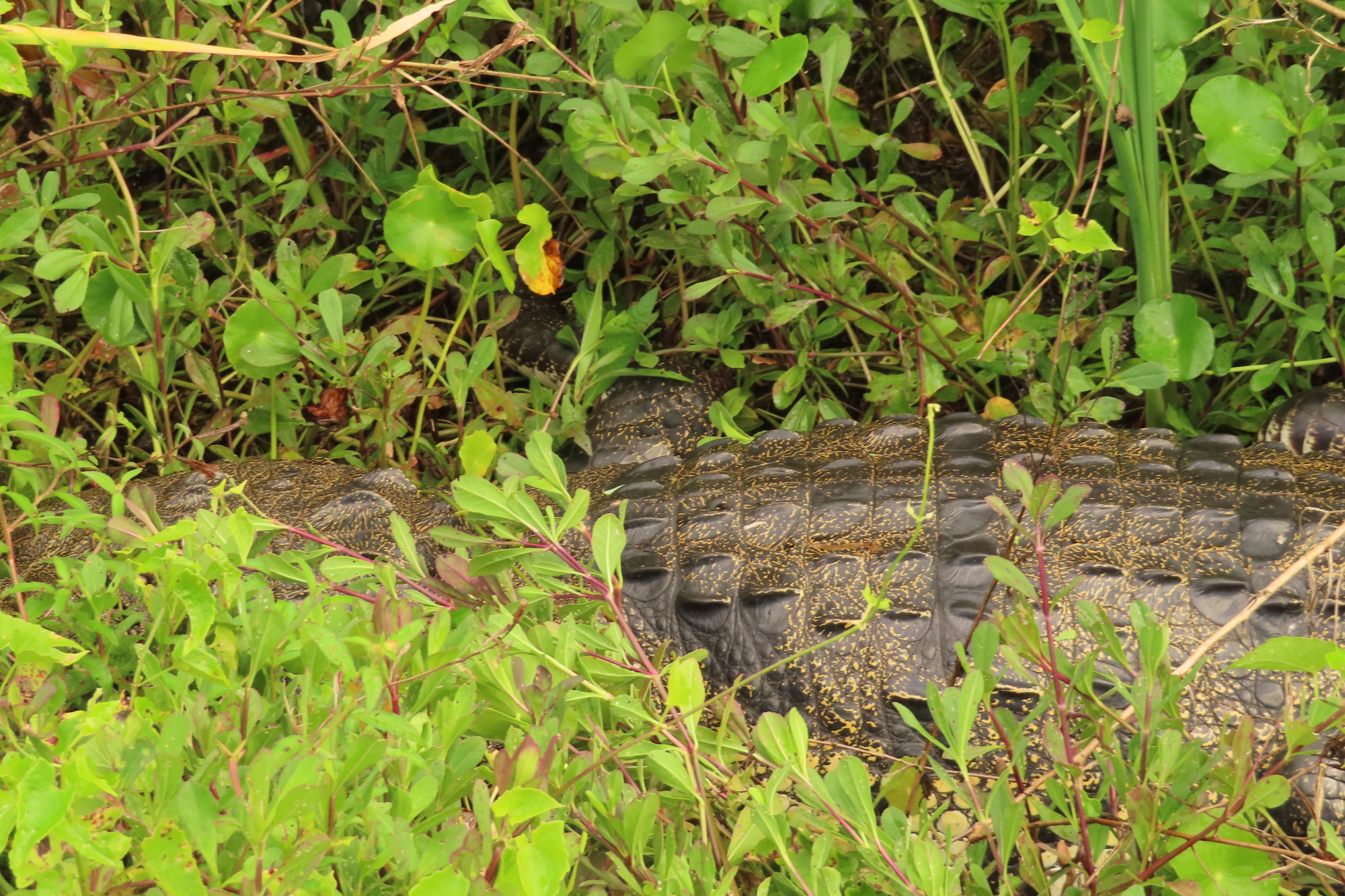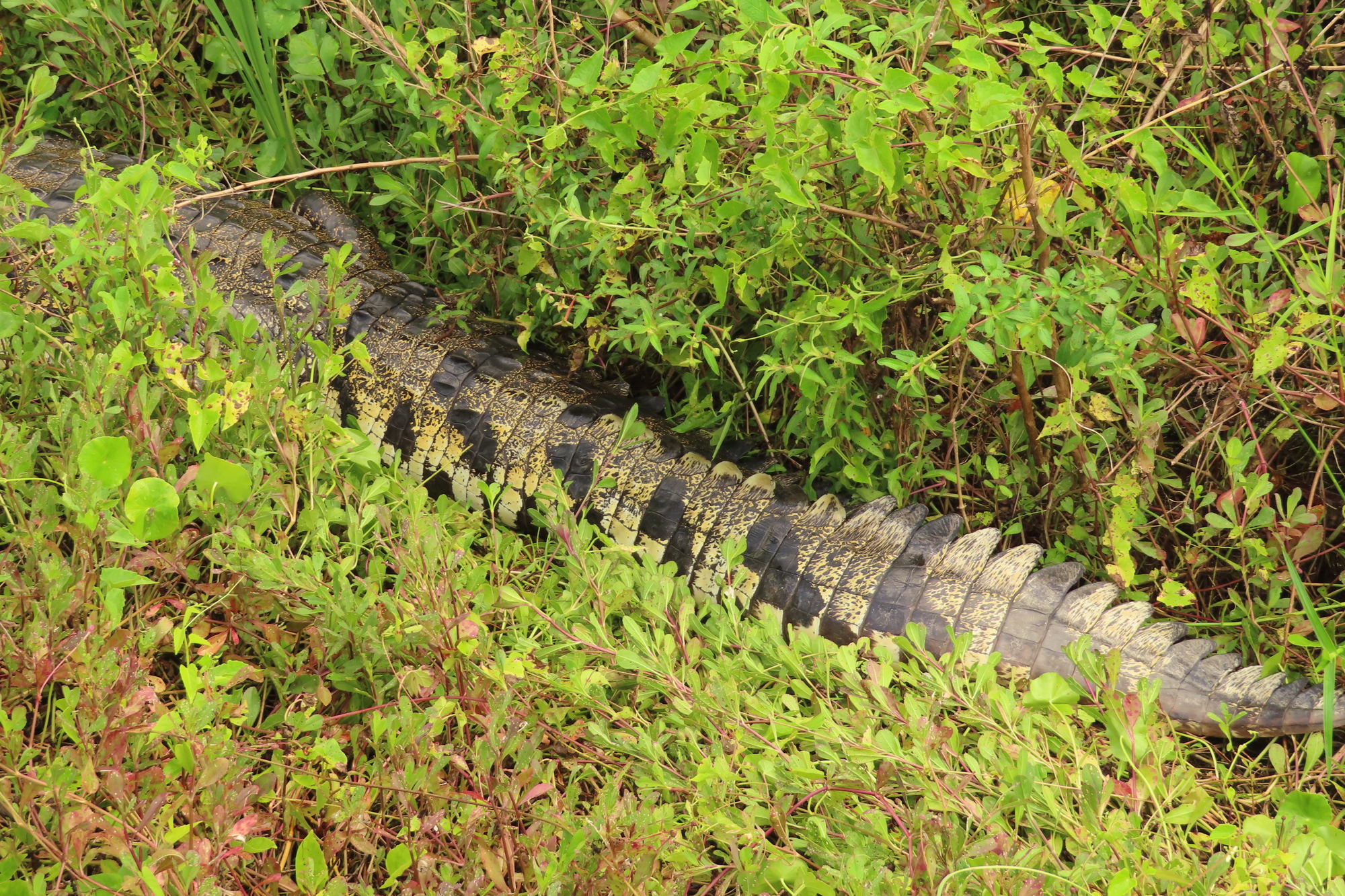 We could see the croc's slithery track in the foliage along the road, until it headed toward Lake Macanxoc, just inside the Ruins reserve.