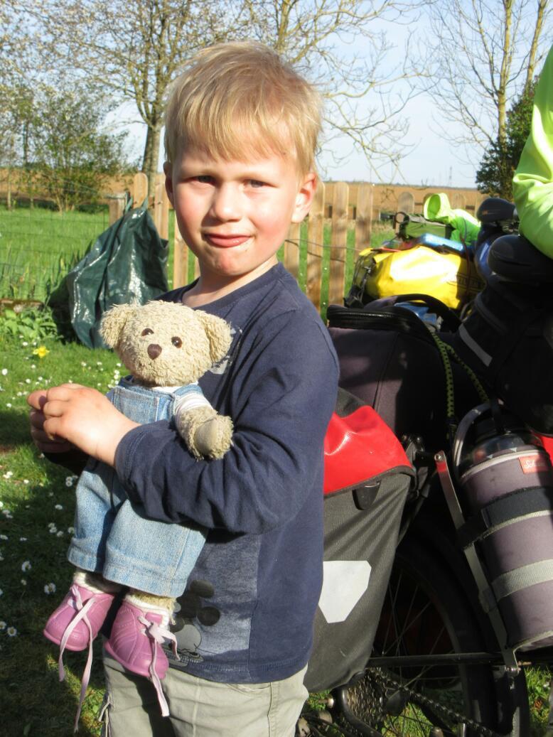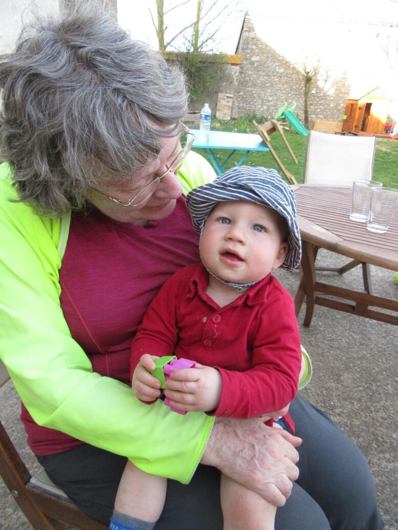 Ah yes, D102, our hope was to make it a further 15km to Saran, on the outskirts of Orleans, where we had located an Ibis hotel. We badly needed a place to rest Dodie's knee and for me to finish (or continue) being sick. But at this point a young woman pulled over in car and invited us to her place, at the last farm along the road in the little hamlet we were passing. The woman turned out to be Florine, and when we arrived we also met her husband Bernard, plus 4 year old Pierre 15 month old Clement. We sat out back in the garden and commenced a long chat. We learned that Florine's brother was a cyclist, and that she had invited us because of the appreciation of the rigours of the road that that brought. But qs time passed we came to realize that this was an in invitation to a chat rather than to a room. In the the house did not have a spare room. So here we were, formerly with a fair chance of reaching a hotel before dark, now stuck. Florine solved this when we mentioned our tent, as there was plenty of room for in the garden.